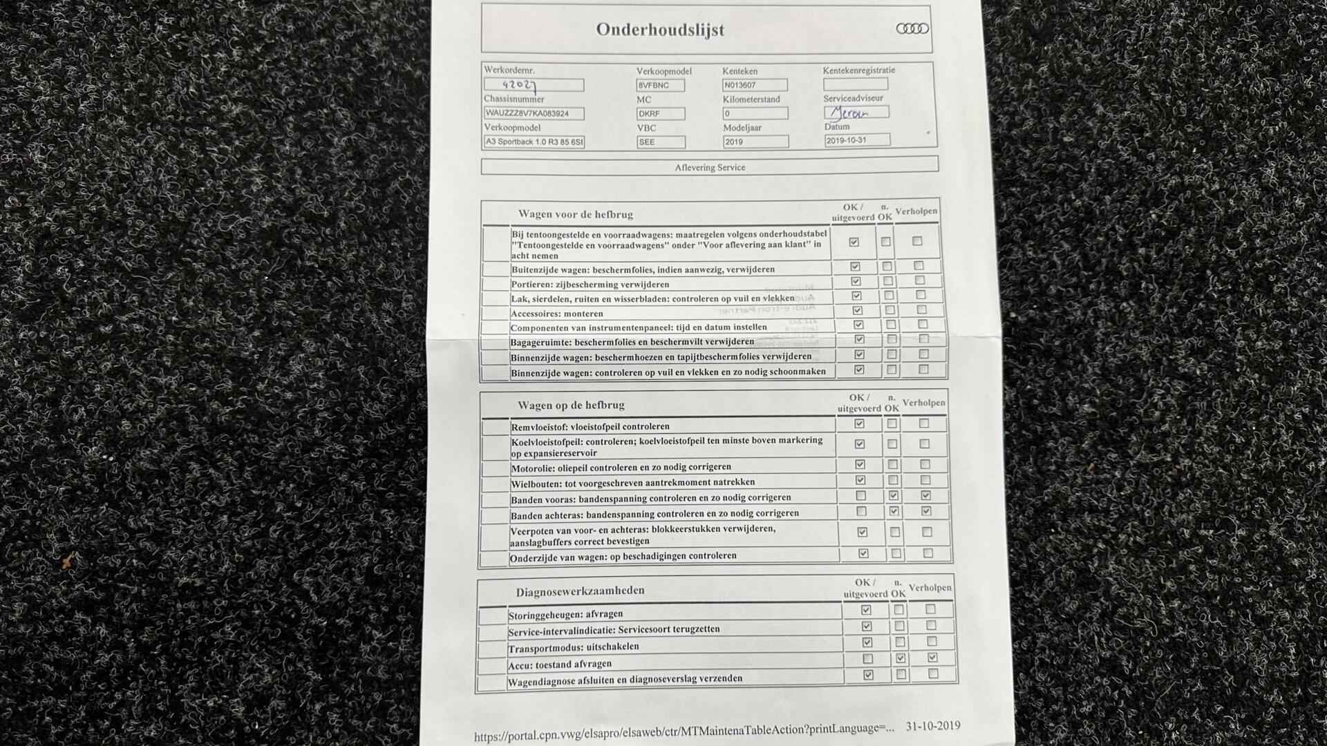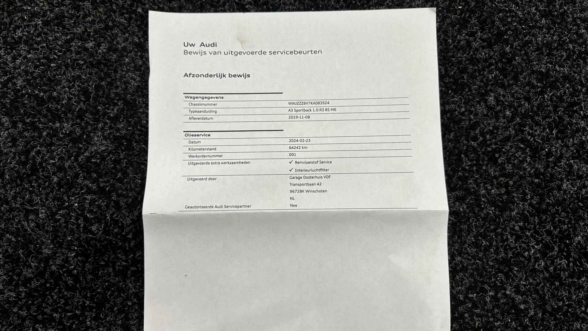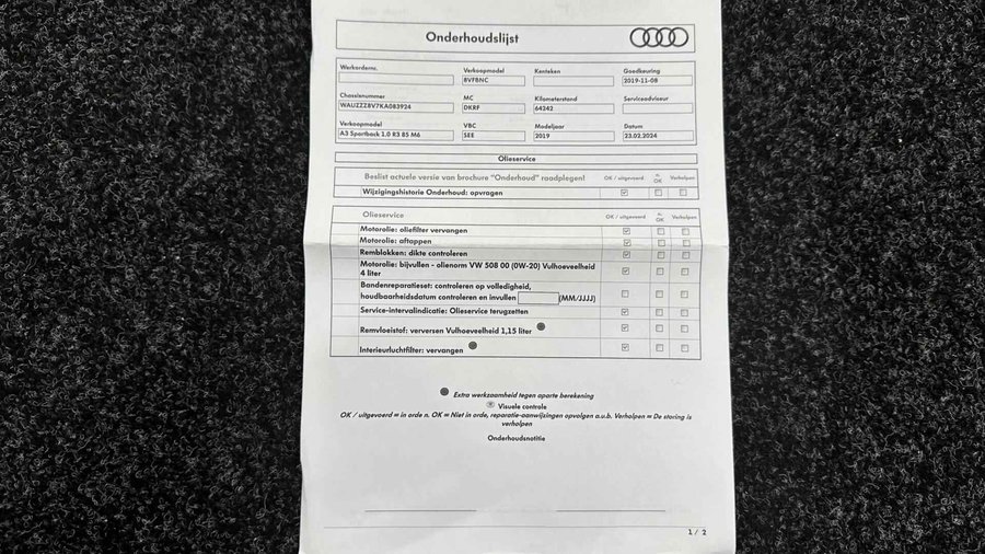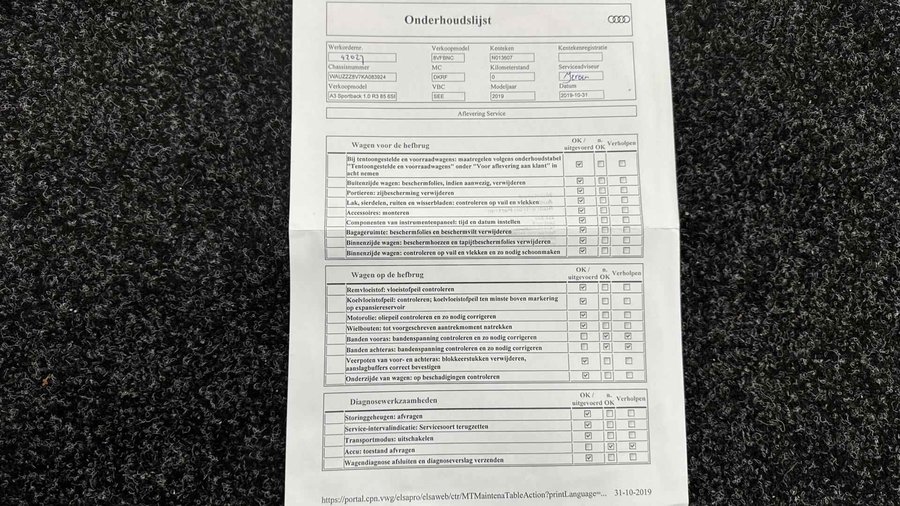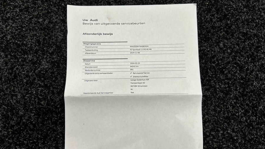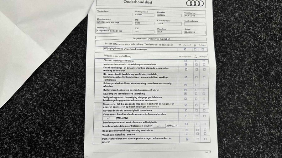 Audi A3 Sportback 30 TFSI Sport Lease Edition NAVI ECC CRUISE LM. - Kenteken: G-171-NV - Merk: Audi - Model: A3 Sportback - APK tot: 10-03-2027 - Tellerstand: 137814 KM - Carrosserievorm: Hatchback - Aantal deuren: 5 - Brandstofsoort: Benzine - Bouwjaar: 2019 - Transmissie: Handgeschakeld - Kleur: zwart - Bekleding: Stof - Kleur interieur: zwart - Motorinhoud: 999 cc - Aantal cilinders: 3 - Motorcode: DKR - Vermogen: 85 kW / 116pk - Ledig gewicht: 1165 kg - Max. trekgewicht: 1300 kg - Aantal zitplaatsen: 5 - Verbruik: 5.1 l/100 km - BTW/Marge: BTW aftrekbaar, de prijs is inclusief BTW - Lengte: 431 cm - Breedte: 179 cm - Aantal sleutels: 2 - Onderhoudshistorie aanwezig: Ja - Motorrijtuigenbelasting: € 172 - 188 per kwartaal - Emissieklasse: Euro 6 Comfort - Boordcomputer - Cruise control - Regensensor Exterieur - Achterruitwisser - Aluminium delen exterieur - Buitenspiegel rechts - Buitenspiegels elektrisch verstelbaar - Buitenspiegels verwarmbaar - Centrale vergrendeling met afstandsbediening - Dimlichten automatisch en regensensor - Koplampreiniging - LED koplampen - Lichtmetalen velgen 17" - Metaalkleur - Park Distance Control - Parkeersensor achter - Sportonderstel - Sportvelgen - Warmtewerend glas Infotainment - Multimedia-voorbereiding - Navigatiesysteem full map - Radio CD speler - Smartphone integratie - Stuur multifunctioneel - WiFi Interieur - Achterbank in delen neerklapbaar - Airco automatisch - Aluminium interieur afwerking - Armsteun voor - Elektrische ramen achter - Elektrische ramen voor - Microvezel bekleding - Middenarmsteun voor - Sportstoelen - Sportstuur - Stuur leder - Stuur verstelbaar - Stuurbekrachtiging snelheidsafhankelijk - Voorstoelen in hoogte verstelbaar Milieu - Start/stop systeem Overige - Anti Blokkeer Systeem - Anti doorSlip Regeling - Bestuurdersairbag - Bluetooth - Connected services - Elektronisch Sper Differentieel - Elektronisch Stabiliteits Programma - Hoofd airbag(s) achter - Hoofd airbag(s) voor - Knie airbag(s) - Passagiersairbag - Zij airbag(s) voor Veiligheid - Alarm klasse 1(startblokkering) - Bandenspanningscontrolesysteem - Isofix bevestiging voor kinderzitjes Met zijn ruimte en zijn prestaties is dit de auto die bij u past. Hij heeft een benzinemotor en een handgeschakelde versnellingsbak. Goeie looks? Jazeker! Maar de sportstoelen zorgen ook voor een goed gesteunde en comfortabele zit. U wordt in deze auto ook getrakteerd op 17 inch lichtmetalen velgen, LED koplampen, sportonderstel, warmtewerend glas, in delen neerklapbare achterbank en snelheidsafhankelijke stuurbekrachtiging. De auto's van vandaag rijden niet alleen subliem, maar luisteren ook goed. Via een speciale app kunt u overal diverse functies controleren en de status van de auto inzien. Er is geen bestemming die het aanwezige full map navigatiesysteem niet kent. Dat rijdt lekker! Always online? Geen probleem: deze auto is voorzien van een eigen WIFI-hotspot. De automatische airconditioning zorgt voor een behaaglijk klimaat in de auto. Gemak en veiligheid gaan prachtig samen. Bijvoorbeeld door de audiobediening op het stuur. U bent in deze Audi ook voorzien van WIFI-hotspot, parkeersensoren achter, regensensor, cruise control, sportstuurwiel en keyless entry. De nieuwste veiligheidssystemen komen in deze Audi A3 Sportback samen. Even bellen voor een afspraak en u kunt deze auto van top tot teen zelf bekijken. U kunt deze deze auto financieren vanaf €299,00 per maand. Voor meer vragen of informatie kunt u ons altijd bellen mailen of smsen. Kijk ook eens naar onze andere voordelige advertenties. Onze garantie/rijklaar pakketten Instapgarantie (€399,-) Auto's van 10 - 15 jaar oud en tot 175.000 km. Inclusief: 12 maand garantie. Nieuwe APK. Algehele check. Kleine onderhoudsbeurt. Excellent garantie (€499,-) Auto's tot 10 jaar oud en tot 175.000 km. Inclusief: 12 maand garantie. Nieuwe APK. Algehele check. Kleine onderhoudsbeurt. Excellent plus garantie (€699,-) Auto's tot 10 jaar oud en tot 175.000 km. Inclusief: 12 maand garantie. Nieuwe APK. Algehele check. Grote onderhoudsbeurt. Exclusive garantie (€1499,-) Speciaal voor onze exclusives. Auto's tot 10 jaar oud en tot 175.000 km. Inclusief: 12 maand garantie Nieuwe APK. Algehele check Inclusief onderhoudsbeurt. Onze advertenties worden met grote zorgvuldigheid op het internet geplaatst. Mocht er onverhoopt toch een fout in staan, dan kan hieraan geen rechten worden ontleend.  Financiering is mogelijk. Whatsapp ons op:  06-552 318 32 RTO autoservice Zuiderdiep 408 7876 AW Valthermond 0599 72 70 12 info@rtoautoservice.nl www.rtoautoservice.nl/
