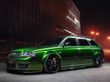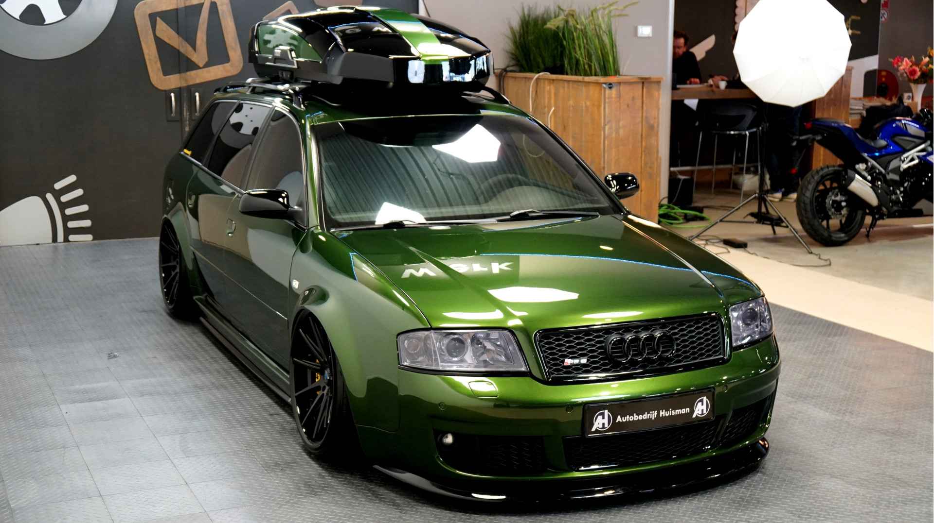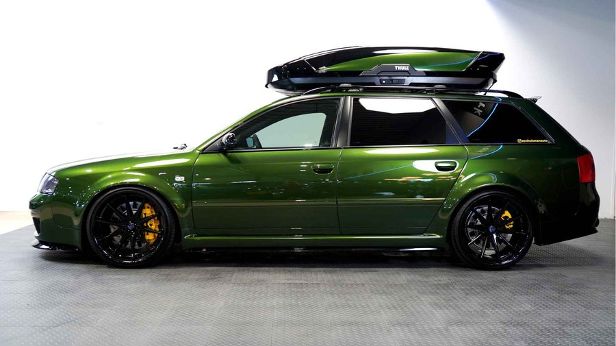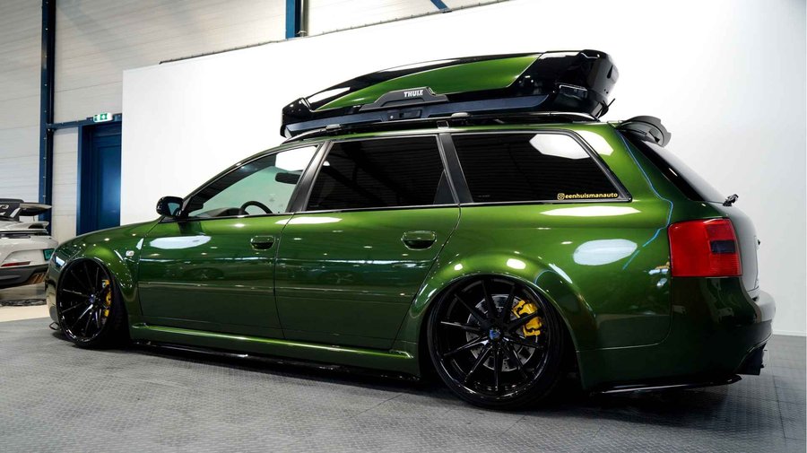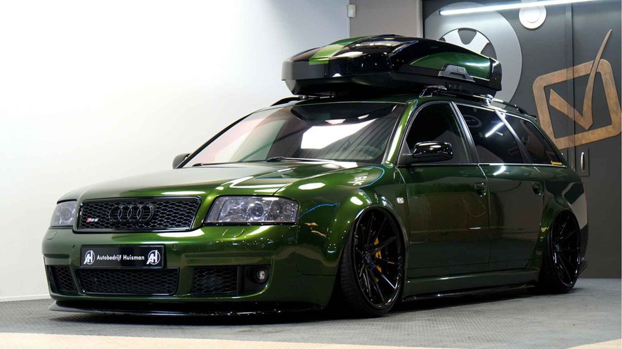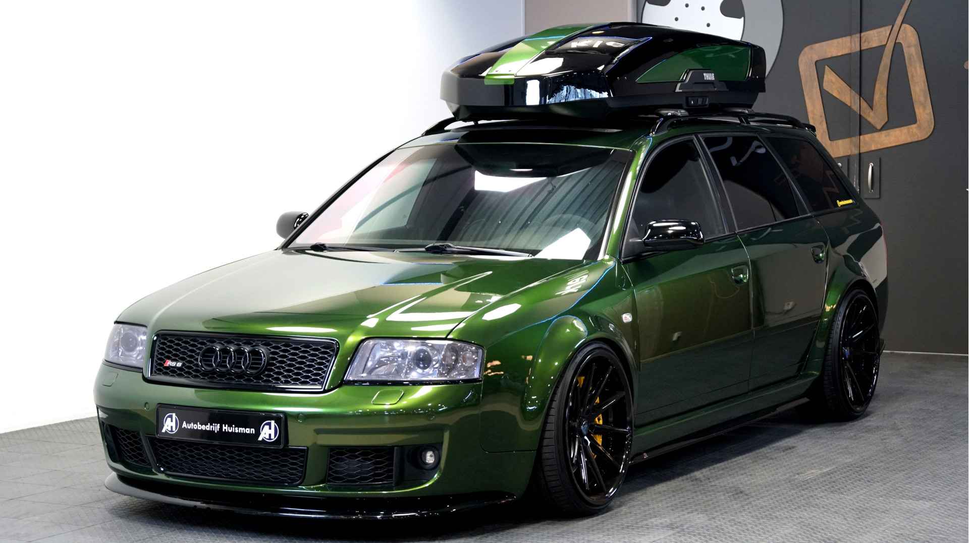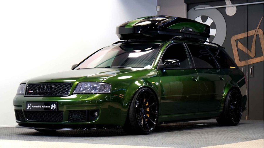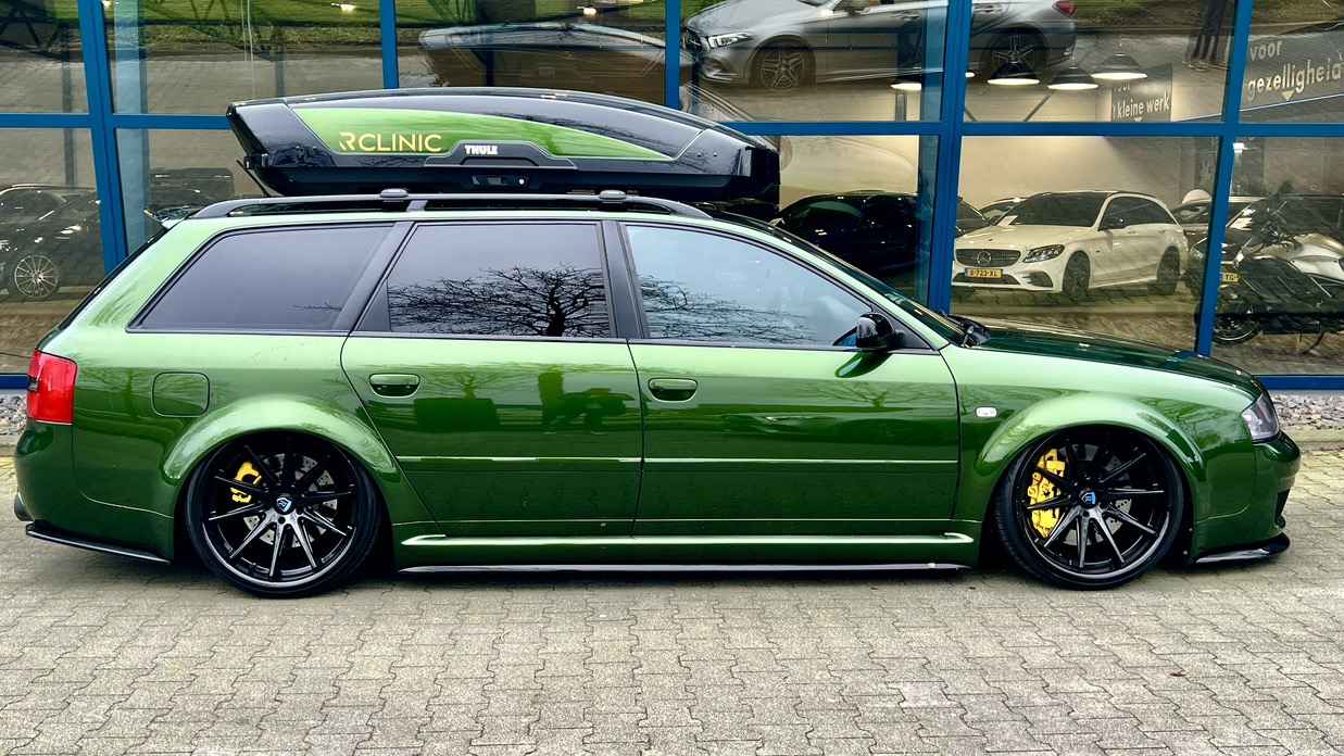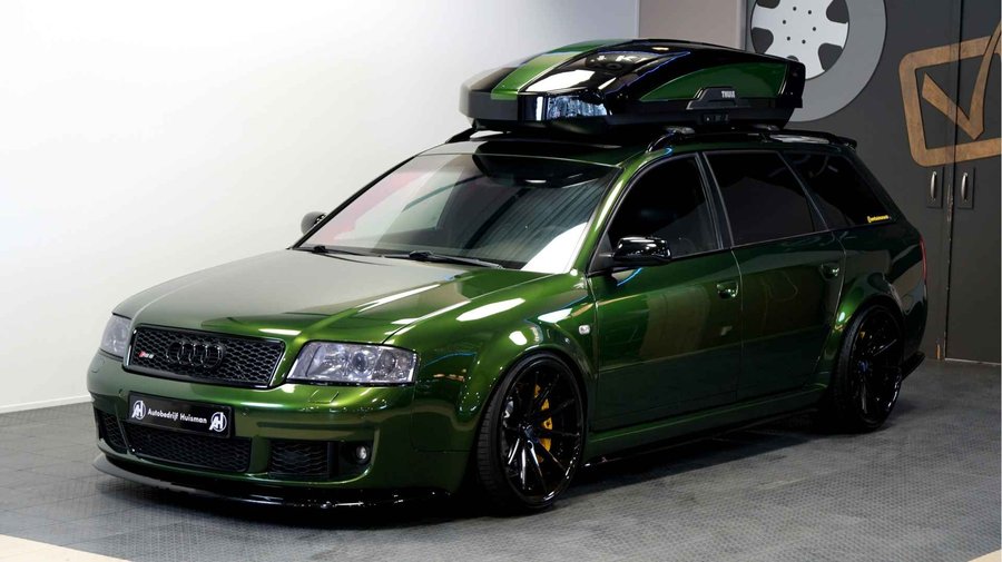 De Audi RS6 C5..... Van zichzelf al niet een onaantrekkelijke auto met prestaties die, zeker ruim 20 jaar gelegen, er niet om logen. Het is ontzettend moeilijk om over deze auto te schrijven, dit unieke exemplaar komt "live" pas echt tot zijn recht. Het is in een Europa een hele bekende auto, welke meeting heeft de auto de show niet gestolen? Kosten noch moeite werden bespaard om dit project tot dat te maken, wat wij u hier nu aanbieden. De verbouwing heeft ruim een jaar geduurd. De hele auto is zeer hoogwaardig afgewerkt en extreem goed gespoten in de prachtige diep donkergroene kleur Verde Ermes van Lamborghini. De remklauwen zijn volledig gereviseerd en in geel gespoten met daarop een leuke Mignon cartoon met een knipoog! Toen kwam het interieur. Het vervangen van alle originele geluidssystemen, vervangen van multimedia station, geluiddemping en plaatsen van een waanzinnige Helix geluidsinstallatie in de kofferbak. Tevens zijn de binnenbekleding van de portieren volledig vervangen en voorzien van isolatie en dubbele Helix speakers. In de A-stijl zijn de tweeters opgenomen. Ook deze zijn volledig geïntegreerd en perfect afgewerkt in alcantara. De ramen zijn getint, alsook de koplampen en achterlichten. Toen is de professionele airride pneumatische vering geplaatst, de spoilers en skirts van Maxton Design en de RGB LED-verlichting. De Thule bagage-box is geheel in stijl meegespoten en is ideaal. Als je een weekend meeting gaat bezoeken is het perfect om spullen mee te nemen en het geeft het geheel natuurlijk een zeer opvallende look. Nu de wielen, dat was ook een uitdaging! Gekozen is voor Rohana velgen vanwege het woeste karakter en de uitstraling. Alle gelakte elementen, alsook ramen en velgen, werden beschermd met een zeer sterke coating. Zoek jij een echte blikvanger, die ook nog eens waanzinnig goed rijdt en klinkt? Wandel dan eens bij ons binnen en laat je verrassen door deze unieke Audi RS6 Showcar! Je bent van harte welkom in Beilen.