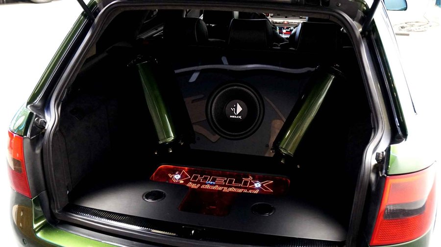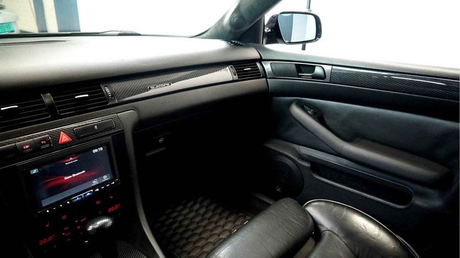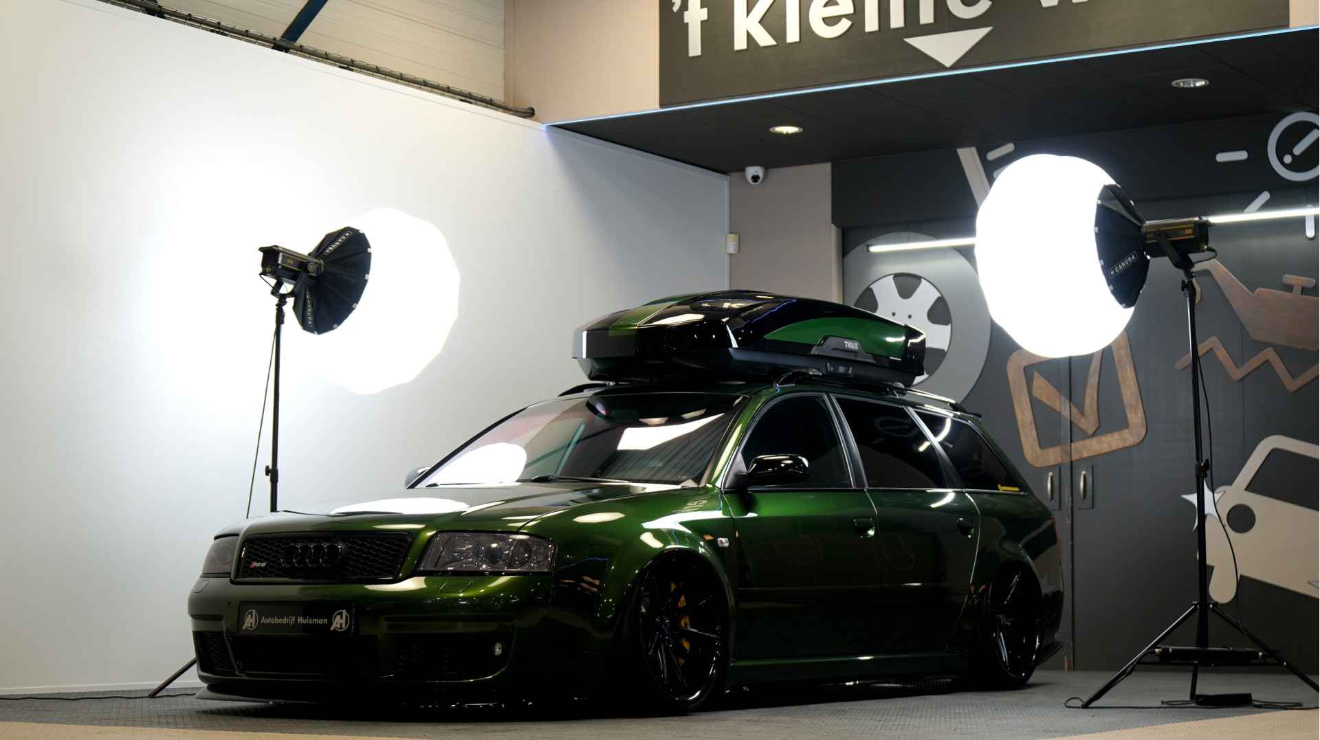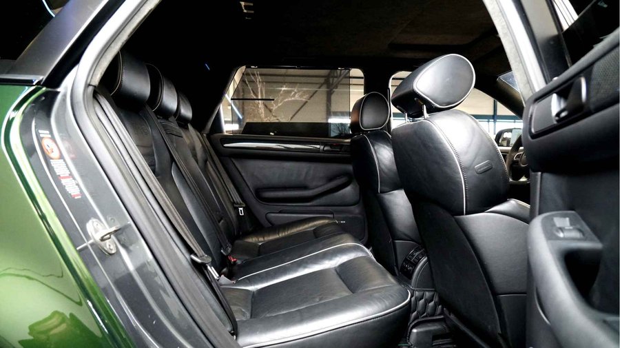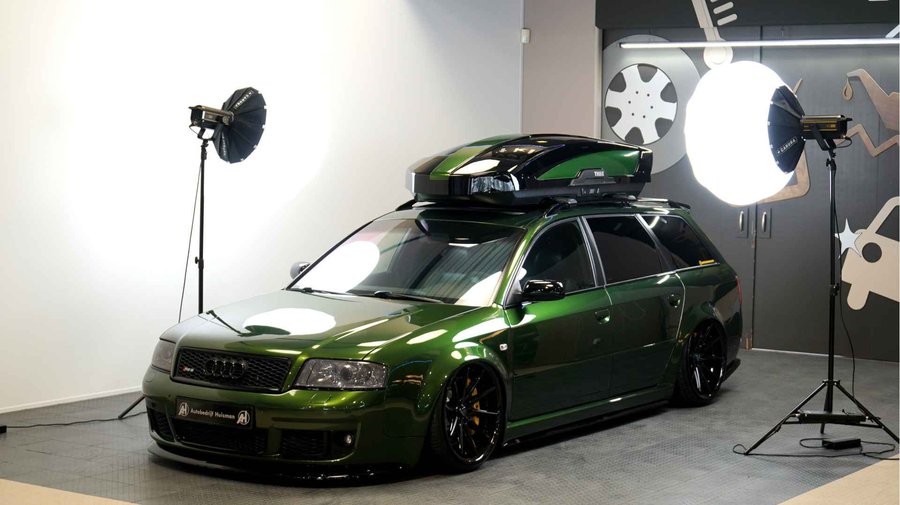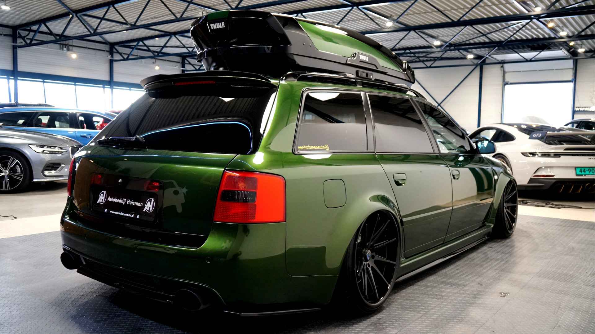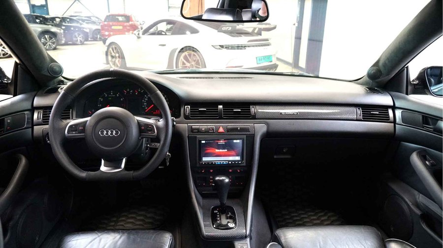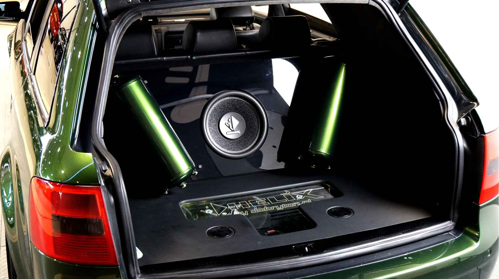 De Audi RS6 C5..... Van zichzelf al niet een onaantrekkelijke auto met prestaties die, zeker ruim 20 jaar gelegen, er niet om logen. Het is ontzettend moeilijk om over deze auto te schrijven, dit unieke exemplaar komt "live" pas echt tot zijn recht. Het is in een Europa een hele bekende auto, welke meeting heeft de auto de show niet gestolen? Kosten noch moeite werden bespaard om dit project tot dat te maken, wat wij u hier nu aanbieden. De verbouwing heeft ruim een jaar geduurd. De hele auto is zeer hoogwaardig afgewerkt en extreem goed gespoten in de prachtige diep donkergroene kleur Verde Ermes van Lamborghini. De remklauwen zijn volledig gereviseerd en in geel gespoten met daarop een leuke Mignon cartoon met een knipoog! Toen kwam het interieur. Het vervangen van alle originele geluidssystemen, vervangen van multimedia station, geluiddemping en plaatsen van een waanzinnige Helix geluidsinstallatie in de kofferbak. Tevens zijn de binnenbekleding van de portieren volledig vervangen en voorzien van isolatie en dubbele Helix speakers. In de A-stijl zijn de tweeters opgenomen. Ook deze zijn volledig geïntegreerd en perfect afgewerkt in alcantara. De ramen zijn getint, alsook de koplampen en achterlichten. Toen is de professionele airride pneumatische vering geplaatst, de spoilers en skirts van Maxton Design en de RGB LED-verlichting. De Thule bagage-box is geheel in stijl meegespoten en is ideaal. Als je een weekend meeting gaat bezoeken is het perfect om spullen mee te nemen en het geeft het geheel natuurlijk een zeer opvallende look. Nu de wielen, dat was ook een uitdaging! Gekozen is voor Rohana velgen vanwege het woeste karakter en de uitstraling. Alle gelakte elementen, alsook ramen en velgen, werden beschermd met een zeer sterke coating. Zoek jij een echte blikvanger, die ook nog eens waanzinnig goed rijdt en klinkt? Wandel dan eens bij ons binnen en laat je verrassen door deze unieke Audi RS6 Showcar! Je bent van harte welkom in Beilen.
