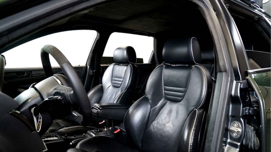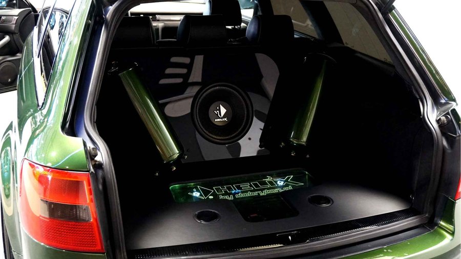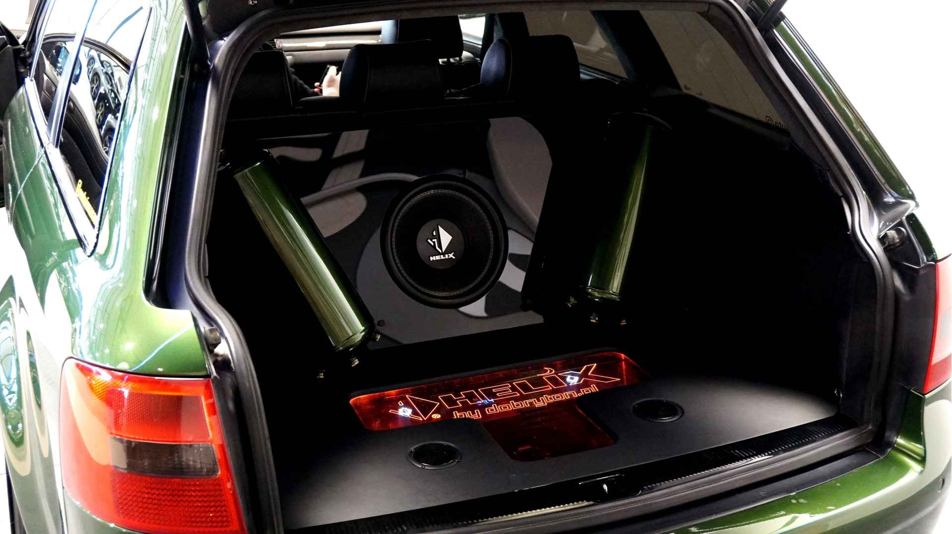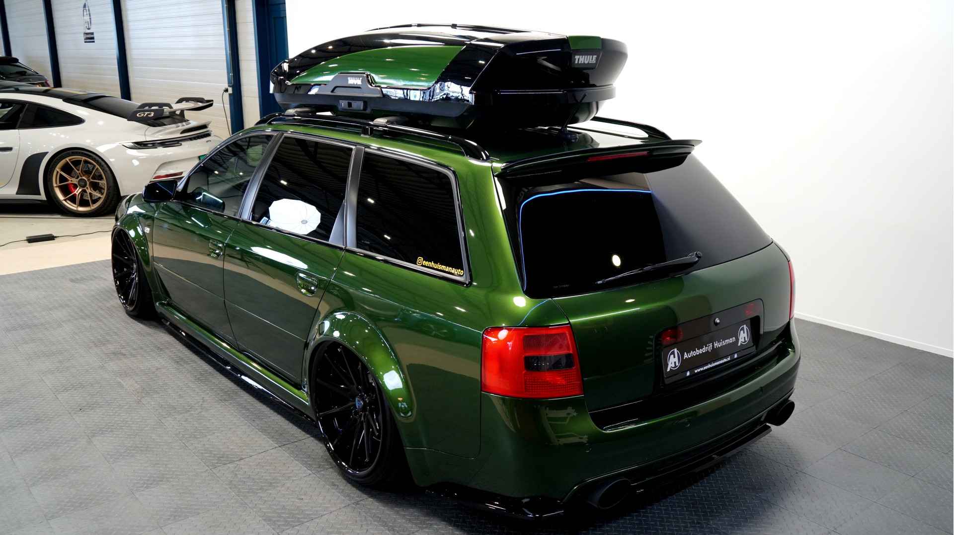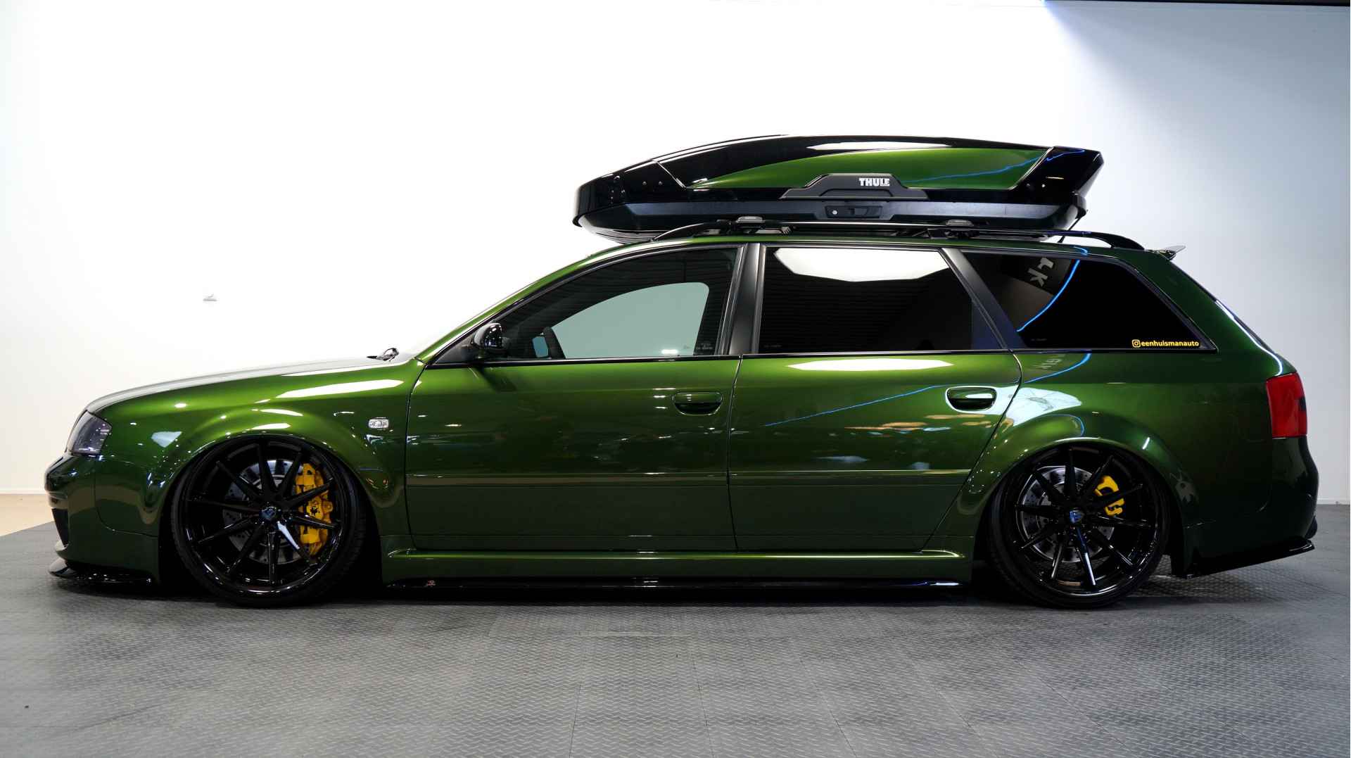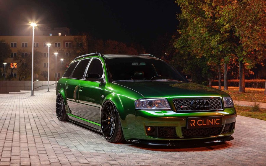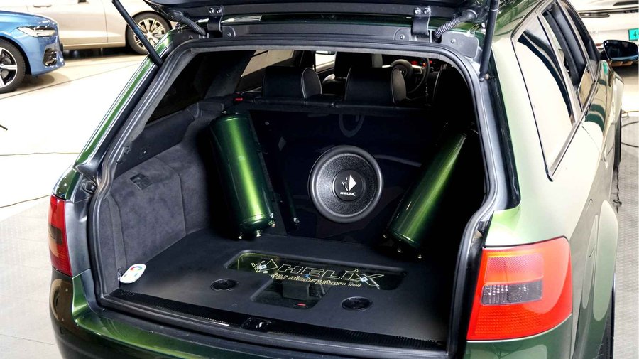 De Audi RS6 C5..... Van zichzelf al niet een onaantrekkelijke auto met prestaties die, zeker ruim 20 jaar gelegen, er niet om logen. Het is ontzettend moeilijk om over deze auto te schrijven, dit unieke exemplaar komt "live" pas echt tot zijn recht. Het is in een Europa een hele bekende auto, welke meeting heeft de auto de show niet gestolen? Kosten noch moeite werden bespaard om dit project tot dat te maken, wat wij u hier nu aanbieden. De verbouwing heeft ruim een jaar geduurd. De hele auto is zeer hoogwaardig afgewerkt en extreem goed gespoten in de prachtige diep donkergroene kleur Verde Ermes van Lamborghini. De remklauwen zijn volledig gereviseerd en in geel gespoten met daarop een leuke Mignon cartoon met een knipoog! Toen kwam het interieur. Het vervangen van alle originele geluidssystemen, vervangen van multimedia station, geluiddemping en plaatsen van een waanzinnige Helix geluidsinstallatie in de kofferbak. Tevens zijn de binnenbekleding van de portieren volledig vervangen en voorzien van isolatie en dubbele Helix speakers. In de A-stijl zijn de tweeters opgenomen. Ook deze zijn volledig geïntegreerd en perfect afgewerkt in alcantara. De ramen zijn getint, alsook de koplampen en achterlichten. Toen is de professionele airride pneumatische vering geplaatst, de spoilers en skirts van Maxton Design en de RGB LED-verlichting. De Thule bagage-box is geheel in stijl meegespoten en is ideaal. Als je een weekend meeting gaat bezoeken is het perfect om spullen mee te nemen en het geeft het geheel natuurlijk een zeer opvallende look. Nu de wielen, dat was ook een uitdaging! Gekozen is voor Rohana velgen vanwege het woeste karakter en de uitstraling. Alle gelakte elementen, alsook ramen en velgen, werden beschermd met een zeer sterke coating. Zoek jij een echte blikvanger, die ook nog eens waanzinnig goed rijdt en klinkt? Wandel dan eens bij ons binnen en laat je verrassen door deze unieke Audi RS6 Showcar! Je bent van harte welkom in Beilen.