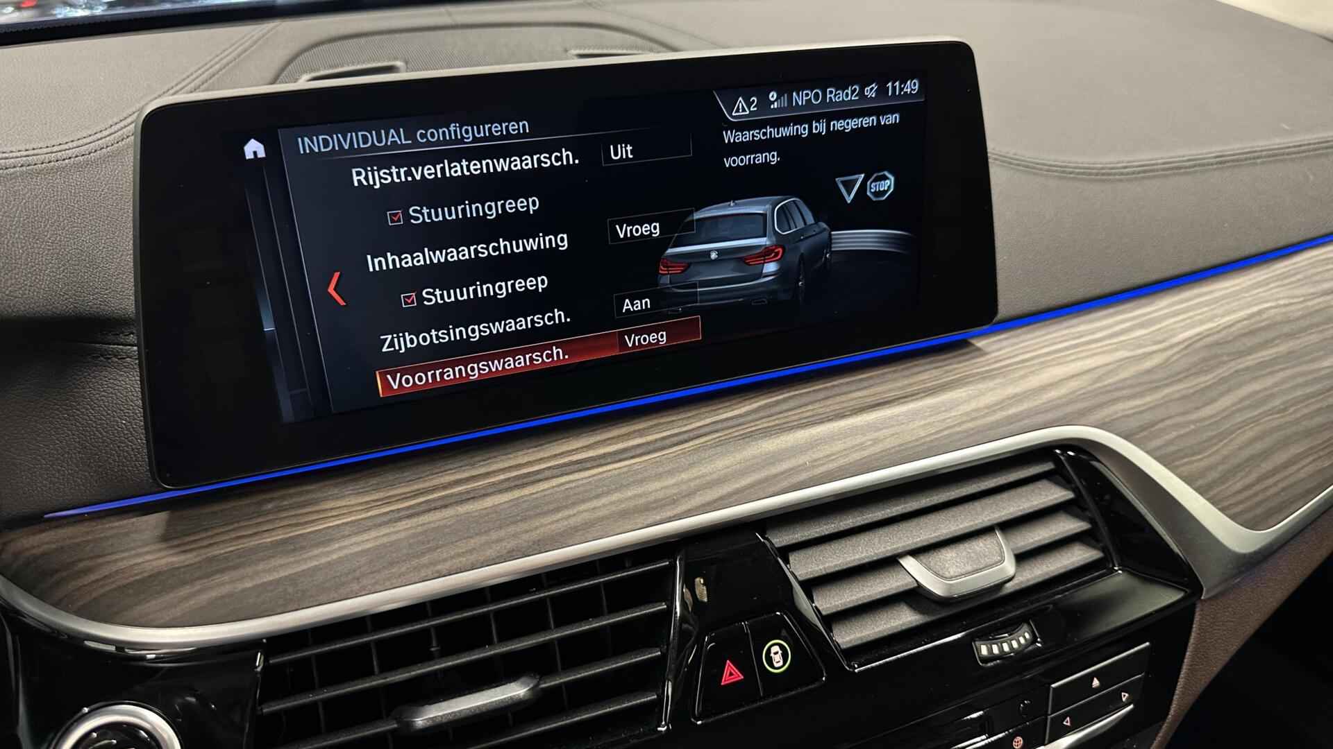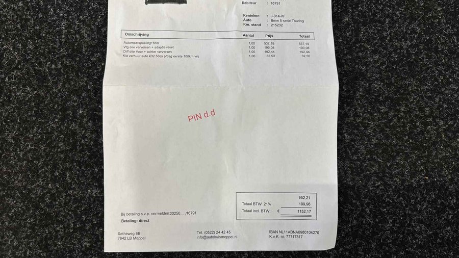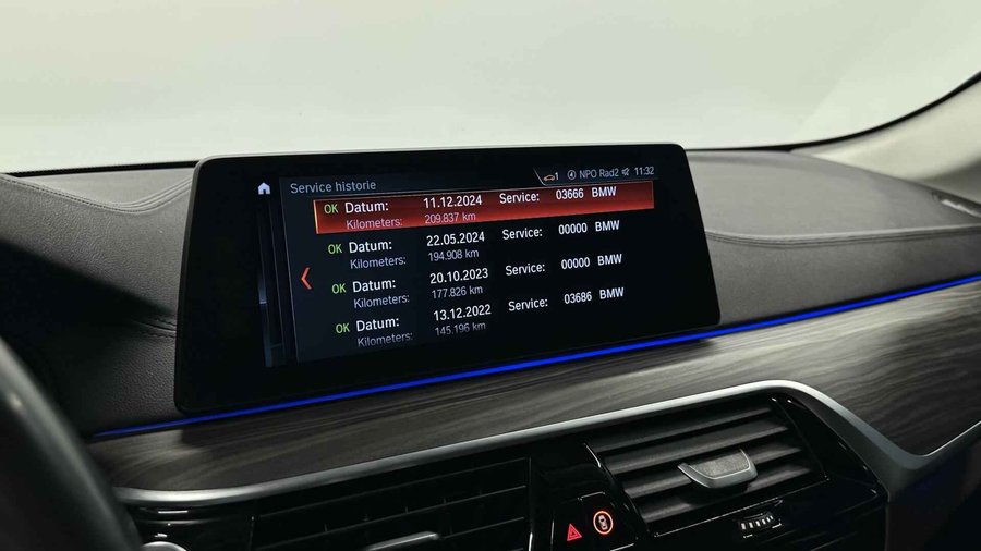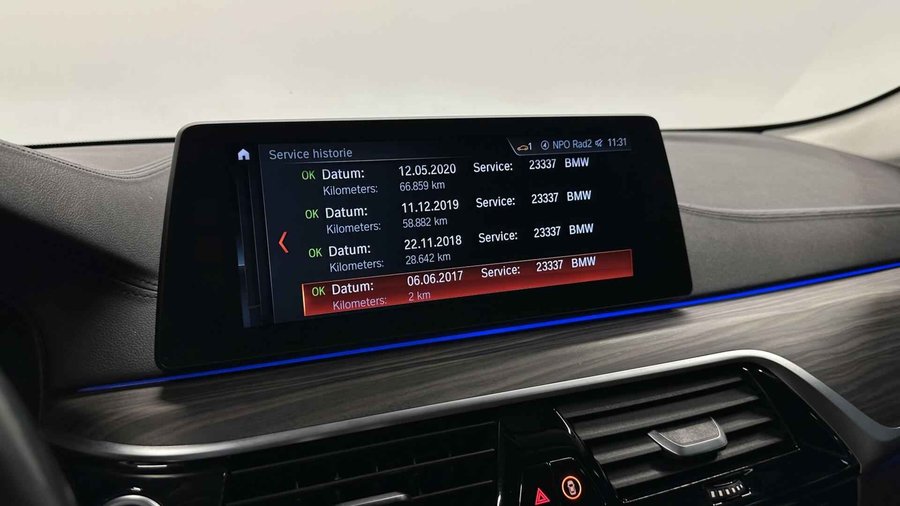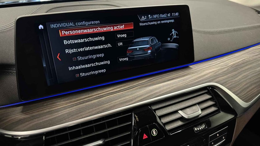 BMW 5-serie Touring 530d xDrive High Executive CAMERA ADAPTIEF CRUISE NAVI LEER TREKHAAK. - Kenteken: J-014-XF - Merk: BMW - Model: 5-serie Touring - APK tot: 18-03-2027 - Tellerstand: 234006 KM - Carrosserievorm: Station - Aantal deuren: 5 - Brandstofsoort: Diesel - Bouwjaar: 2017 - Transmissie: Automaat - Kleur: blauw - Bekleding: Leder - Kleur interieur: bruin - Motorinhoud: 2993 cc - Aantal cilinders: 6 - Motorcode: B57D30A - Vermogen: 195 kW / 266pk - Ledig gewicht: 1775 kg - Max. trekgewicht: 2000 kg - Aantal zitplaatsen: 5 - Verbruik: 5.5 l/100 km - BTW/Marge: Marge, de BTW is niet aftrekbaar - Lengte: 494 cm - Breedte: 187 cm - Hoogte: 1498 cm - Aantal sleutels: 2 - Onderhoudshistorie aanwezig: Ja - Motorrijtuigenbelasting: € 636 - 667 per kwartaal - Emissieklasse: Euro 6 Pakket: Audio pakket - Audio installatie - DAB - Draadloze telefoonlader - Spraakbediening Pakket: Comfort Access pakket - Elektrisch bedienbare achterklep met sensorsturing - Keyless entry Pakket: Comfort pakket voorstoelen - Comfortstoel(en) - Elektrisch verstelbare stoel(en) met geheugen - Lendesteun(en) verstelbaar Pakket: Elektrisch pakket - Elektrisch verstelbare stoel(en) met geheugen - Stuurkolom elektrisch verstelbaar Pakket: M Sportpakket - Aluminium interieur afwerking - M Aerodynamica - Sportonderstel - Sportstoelen Pakket: Parking Pack - Achteruitrijcamera - Parkeer assistent Pakket: Sport Line - Sportstoelen Comfort - Boordcomputer - Regensensor Exterieur - Achterruit apart te openen - Achterruitwisser - Adaptief demping systeem - Buitenspiegel rechts - Buitenspiegels elektrisch inklapbaar - Buitenspiegels elektrisch verstelbaar - Buitenspiegels verwarmbaar - Centrale vergrendeling met afstandsbediening - Chroom delen exterieur - Dakrails - Dimlichten automatisch - Elektrisch bedienbare achterklep - Extra getint glas achter - Keyless entry - Koplampen adaptief - Koplampreiniging - LED koplampen - Lichtmetalen velgen 19" - Metaalkleur - Park Distance Control - Parkeer assistent - Parkeersensor voor en achter - Ruitensproeiers/wisserbladen verwarmbaar - Sportonderstel - Sportvelgen - Trekhaak - Zonnescherm zijruiten Infotainment - Audio installatie premium - DAB - DVD speler - Head-up display - Multimedia-voorbereiding - Navigatiesysteem full map + hard disk - Radio-CD/MP3 speler - Spraakbediening - Stuur multifunctioneel - WiFi Interieur - Achterbank in delen neerklapbaar - Achterbank verwarmd - Airco automatisch - Airco separaat achter - Aluminium interieur afwerking - Armsteun achter - Armsteun voor - Comfortstoel(en) - Cruise control adaptief met Stop&Go - Elektrisch verstelbare stoel(en) met geheugen - Elektrische ramen voor en achter - Houtafwerking interieur - Interieurklimaat vooraf instelbaar - Lederen bekleding - Lederen interieur - Lendesteun(en) verstelbaar - Luxe lederen bekleding - Middenarmsteun voor - Sportstoelen - Sportstuur - Stoel ventilatie voor - Stuur leder - Stuur verstelbaar - Stuur verwarmd - Stuurbekrachtiging snelheidsafhankelijk - Stuurkolom elektrisch verstelbaar - Voorstoel(en) elektrisch verstelbaar - Voorstoel(en) met massagefunctie - Voorstoelen verwarmd Milieu - Start/stop systeem Overige - Achteropkomend verkeer waarschuwing - Achteruitrij assistent - Anti Blokkeer Systeem - Anti doorSlip Regeling - Autonomous Emergency Braking - Bestuurdersairbag - Bluetooth - Bots herkenning en activatie - Bots waarschuwing systeem - Brake Assist System - Connected services - Dodehoek detectie - Draadloze telefoonlader - Elektronisch Stabiliteits Programma - Hoofd airbag(s) achter - Hoofd airbag(s) voor - Keyless start - LED mistlampen - Luchtvering en automatische niveauregeling - M Aerodynamica - Passagiersairbag - Rondomzicht camera - Schakelpaddles - Variabele stuuroverbrenging - Zij airbag(s) voor Veiligheid - Achterasbesturing - Achteruitrijcamera - Alarm klasse 3 - Bandenspanningscontrolesysteem - Binnen/buitenspiegel aut. dimmend - Hill hold functie - Isofix bevestiging voor kinderzitjes - Rijstrooksensor Kilometer na kilometer, bocht na bocht levert deze BMW 5-serie Touring de beste rijprestaties. Het is een auto die 233952 kilometer heeft gelopen, het bouwjaar is 2017. Deze diesel heeft een automatische transmissie. De hoogwaardige uitstraling van deze auto wordt benadrukt door de lederen bekleding. Koude start? Niet met de verwarmbare voorstoelen! En allebei ook nog eens voorzien van massagefunctie tegen stramme rug en schouders. Neem plaats op de comfortabele stoelen. Dankzij de elektrische bediening en het geheugen is het eenvoudig om hierin de beste zitpositie te vinden. De elektrisch bedienbare achterklep opent met een druk op de knop. Ook de passagiers achterin ervaren het ultieme comfort, dankzij de verwarmde achterbank. Ook is de auto voorzien van: 19 inch lichtmetalen velgen, LED koplampen, sport line onderstel, adaptief dempingsysteem, donker getint glas achter en in delen neerklapbare achterbank. Het gebruik van de 360 graden camera op deze auto helpt u bij het navigeren door lastige rijbanen en het drukke stadsverkeer. Adaptive cruise control houdt de ingestelde snelheid vast en houdt automatisch afstand tot uw voorligger. De auto is voorzien van een trekhaak en is een uitstekende caravantrekker. Veilig en comfortabel rijden wordt nog eens versterkt door Connected Services, zodat u diverse vitale functies van de auto altijd kunt checken in de app. Elk genre muziek komt tot z'n recht. Het high performance audiosysteem is perfect in te regelen op uw smaak! Met dashboard met spraakbediening, navigatiesysteem met harde schijf, WIFI-hotspot, achteropkomend verkeer waarschuwing, automatische airconditioning en schakelpaddles aan het stuur is deze BMW helemaal compleet. In de BMW 5-serie Touring heeft uw veiligheid en die van uw omgeving prioriteit. Het Lane-keeping systeem let constant op en waarschuwt of corrigeert als u onoplettend over de lijnen van de rijstrook gaat. Botsingen met een voorligger gebeuren relatief vaak. De forward collision warning slaat tijd