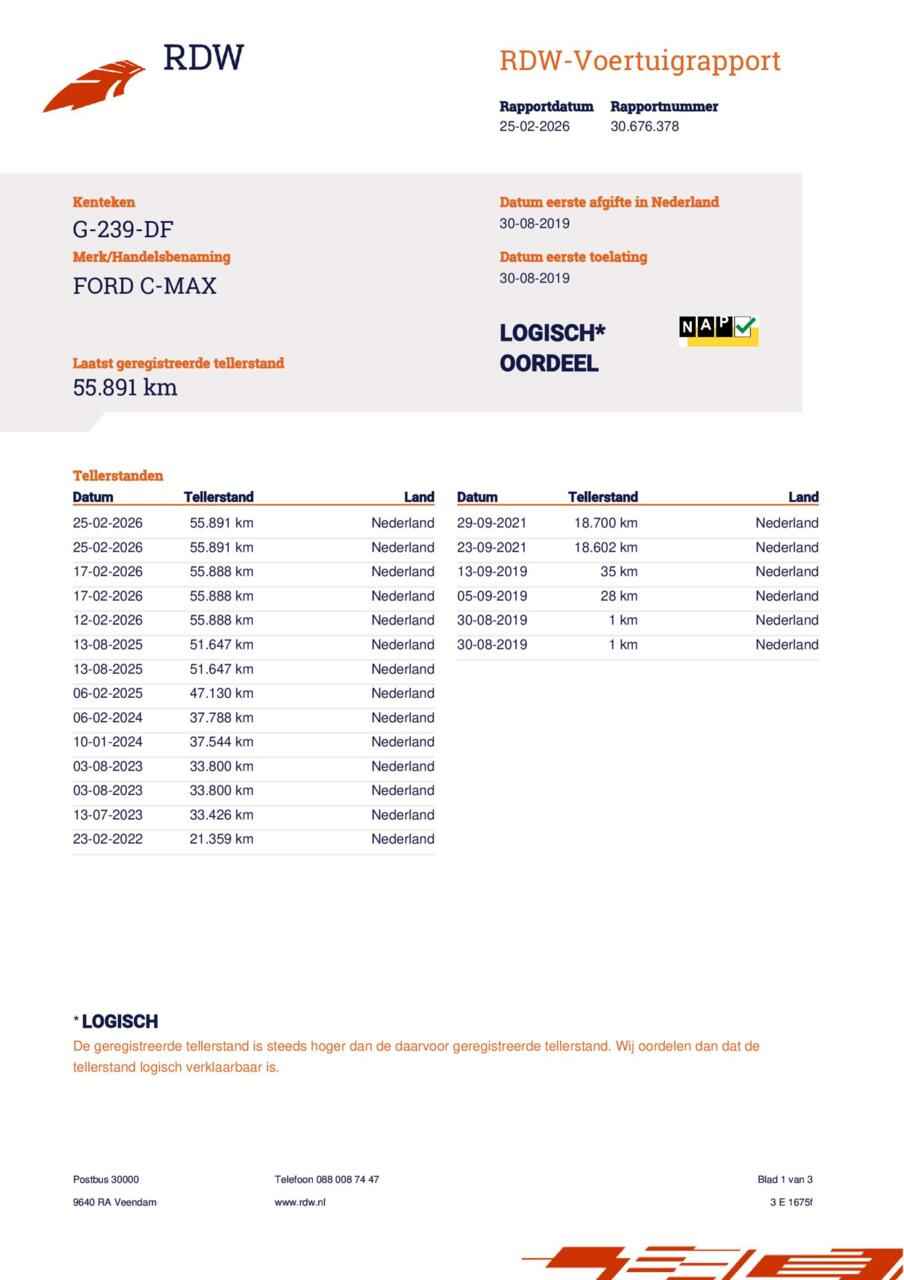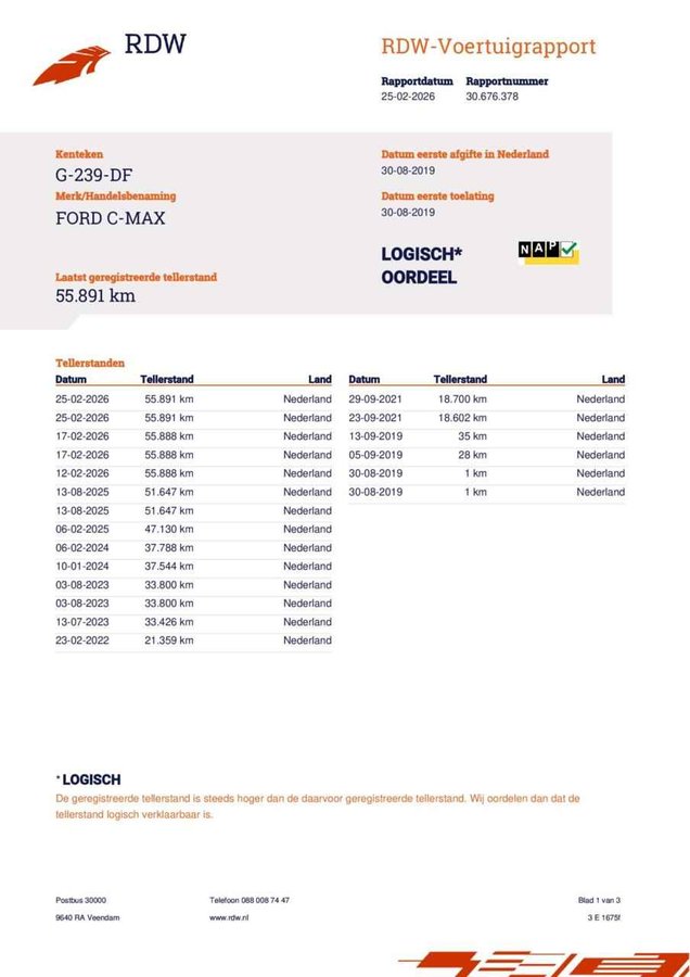 Ford C-Max 1.0 Titanium CAMERA TREKHAAK CARPLAY NAVI ECC CRUISE LM. - Kenteken: G-239-DF - Merk: Ford - Model: C-Max - APK tot: 11-03-2028 - Tellerstand: 55906 KM - Carrosserievorm: MPV - Aantal deuren: 5 - Brandstofsoort: Benzine - Bouwjaar: 2019 - Transmissie: Handgeschakeld - Kleur: grijs - Bekleding: Stof - Kleur interieur: zwart - Motorinhoud: 998 cc - Aantal cilinders: 3 - Motorcode: B7DA - Vermogen: 92 kW / 125pk - Ledig gewicht: 1373 kg - Max. trekgewicht: 1200 kg - Aantal zitplaatsen: 5 - Verbruik: 5.8 l/100 km - BTW/Marge: Marge, de BTW is niet aftrekbaar - Lengte: 438 cm - Breedte: 183 cm - Aantal sleutels: 2 - Onderhoudshistorie aanwezig: Ja - Motorrijtuigenbelasting: € 226 - 247 per kwartaal - Emissieklasse: Euro 6 Pakket: Parking Pack - Achteruitrijcamera - Buitenspiegels elektrisch inklapbaar - Parkeer assistent - Parkeersensor voor Pakket: Parkeer pakket - Buitenspiegels elektrisch inklapbaar - Parkeer assistent - Parkeersensor voor en achter Comfort - Boordcomputer - Cruise control Exterieur - Achterruitwisser - Buitenspiegel rechts - Buitenspiegels elektrisch inklapbaar - Buitenspiegels elektrisch verstelbaar - Buitenspiegels verwarmbaar - Centrale vergrendeling - Chroom delen exterieur - Dimlichten automatisch - Extra getint glas achter - Keyless entry - LED dagrijverlichting - Lichtmetalen velgen 17" - Metaalkleur - Mistlampen voor - Park Distance Control - Parkeer assistent - Parkeersensor achter - Parkeersensor voor en achter - Ruitensproeiers/wisserbladen verwarmbaar - Speciale kleur - Sportvelgen - Trekhaak - Verwarmde voorruit Infotainment - Audio installatie - Multimedia-voorbereiding - Navigatiesysteem full map - Radio CD speler - Radio-CD/MP3 speler - Smartphone integratie - Spraakbediening - Stuur multifunctioneel Interieur - Achterbank in delen neerklapbaar - Achterstoelen drie - Achterstoelen uitneembaar - Airco automatisch - Armsteun voor - Bestuurdersstoel in hoogte verstelbaar - Binnenspiegel automatisch dimmend - Electronic climate control - Elektrische ramen achter - Elektrische ramen voor - Lederen versnellingspook - Lendesteun(en) verstelbaar - Microvezel bekleding - Middenarmsteun voor - Passagiersstoel in hoogte verstelbaar - Stuur en versnellingspook (kunst)leder - Stuur leder - Stuur verstelbaar - Stuurbekrachtiging snelheidsafhankelijk Milieu - Start/stop systeem Overige - Achteropkomend verkeer waarschuwing - Achteruitrij assistent - Anti Blokkeer Systeem - Anti doorSlip Regeling - Autonomous Emergency Braking - Bestuurdersairbag - Bluetooth - Brake Assist System - Connected services - Elektronisch Stabiliteits Programma - Elektronische remkrachtverdeling - Hoofd airbag(s) achter - Hoofd airbag(s) voor - Keyless start - Passagiersairbag - Zij airbag(s) voor Veiligheid - Achteruitrijcamera - Alarm klasse 1(startblokkering) - Bandenspanningscontrolesysteem - Isofix bevestiging voor kinderzitjes Een keurige auto, dat is deze Ford C-Max, die 55895 kilometer heeft gelopen. De aandrijving van deze Ford wordt verzorgd door een driecilinder benzinemotor en een handgeschakelde versnellingsbak. Tot de voorzieningen van deze auto behoren 17 inch lichtmetalen velgen, LED-dagrijverlichting, in hoogte verstelbare passagiersstoel, donker getint glas achter, in delen neerklapbare achterbank en verstelbare lendensteunen. De hoogwaardige achteruitrijcamera en het display met hoge resolutie zorgen dat helemaal niets u meer ontgaat van wat er achter de auto gebeurt. Spraakbediening herkent uw stem en voert opdrachten uit terwijl u beide handen aan het stuur houdt. Deze Ford C-Max is voorzien van remote services. Via uw smartphone bedient u diverse functies ook op afstand en krijgt u informatie over de status van uw auto. Van A naar B zonder omwegen: altijd uw eigen full map navigatiesysteem aan boord! Op een drukke weg heeft u soms ogen in uw achterhoofd nodig. De sensoren aan de achterzijde nemen die functie over en geven een achteropkomend verkeer waarschuwing als een achterligger te dicht op u zit. Ook automatische airconditioning, cruise control, keyless entry, automatisch dimmende binnenspiegel, lederen stuur en isofix-aansluiting horen tot de voorzieningen op deze auto. In de Ford C-Max heeft uw veiligheid en die van uw omgeving prioriteit. Brake assist verhoogt de remdruk in een noodsituatie zodat u sneller stil staat. Proefrit maken? Bel ons en we zetten 'm voor u klaar! U kunt deze deze auto financieren vanaf €279,00 per maand. Voor meer vragen of informatie kunt u ons altijd bellen mailen of smsen. Kijk ook eens naar onze andere voordelige advertenties. Onze garantie/rijklaar pakketten Instapgarantie (€399,-) Auto's van 10 - 15 jaar oud en tot 175.000 km. Inclusief: 12 maand garantie. Nieuwe APK. Algehele check. Kleine onderhoudsbeurt. Excellent garantie (€499,-) Auto's tot 10 jaar oud en tot 175.000 km. Inclusief: 12 maand garantie. Nieuwe APK. Algehele check. Kleine onderhoudsbeurt. Excellent plus garantie (€699,-) Auto's tot 10 jaar oud en tot 175.000 km. Inclusief: 12 maand garantie. Nieuwe APK. Algehele check. Grote onderhoudsbeurt. Exclusive garantie (€1499,-) Speciaal voor onze exclusives. Auto's tot 10 jaar oud en tot 175.000 km. Inclusief: 12 maand garantie Nieuwe APK. Algehele check Inclusief onderhoudsbeurt. Onze advertenties worden met grote zorgvuldigheid op het internet geplaatst. Mocht er onverhoopt toch een fout in staan, dan kan hieraan geen rechten worden ontleend.  Financiering is mogelijk. Whatsapp ons op:  06-552 318 32 RTO autoservice Zuiderdiep 408 7876 AW Valthermond 0599 72 70 12 info@rtoautoservice.nl www.rtoautoservice.nl/
