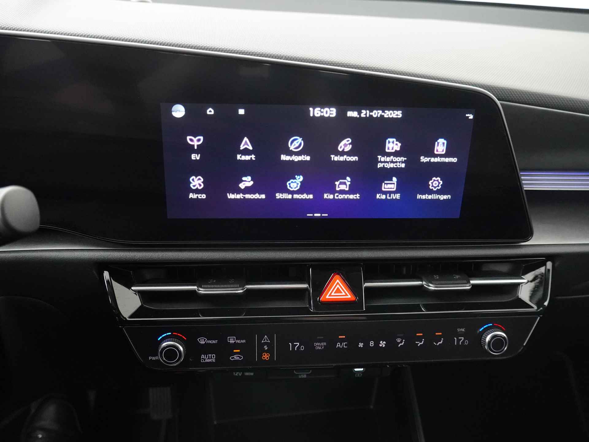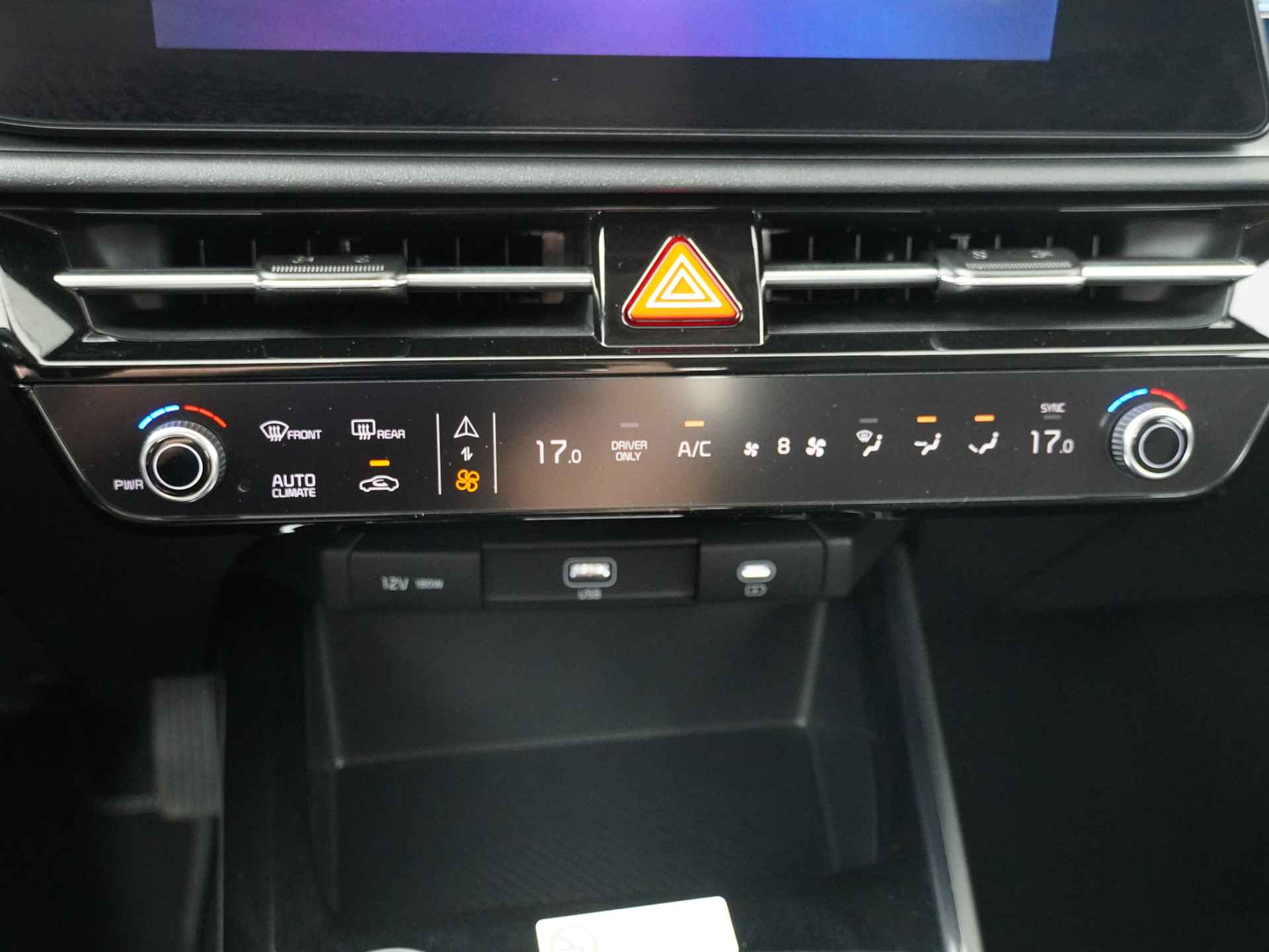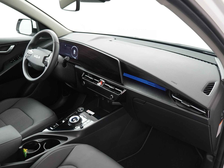 Iedere rit in een elektrische auto is een weldaad: u rijdt ontspannen en in alle rust, er is volop vermogen en u komt verkwikt op uw bestemming aan. Milieuvriendelijk, stil en uitstekende rijprestaties: dat zijn de voordelen van de elektromotor. Een krachtige motor geeft deze auto zijn sportieve prestaties. Ook 17 inch lichtmetalen velgen, LED-dagrijverlichting, in hoogte verstelbare passagiersstoel, in delen neerklapbare achterbank en LED-achterlichten zijn aan boord. Snelheid, brandstofinfo, noem maar op. Het digitale dashboard houdt u permanent op de hoogte. Goed en overzichtelijk. Comfortabel en veilig achteruitrijden gaat gemakkelijker dan ooit met behulp van de achteruitrijcamera. Als u de adaptive cruise control inschakelt, regelt de auto zelf de snelheid en de afstand tot de auto voor u. Filerijden? Doodvermoeiend. Daarom helpt de file assistent zo nodig een handje. Door automatisch afstand te houden, en te stoppen als uw voorligger stilstaat. Een smartphone met internetverbinding legt eenvoudig overal contact met de auto. U kunt functies activeren en de conditie van de auto monitoren. Ook dashboard met spraakbediening, full map navigatiesysteem, automatische airconditioning, sportstuur met schakelpaddels, DAB ontvangst en regensensor horen tot de voorzieningen op deze auto. Elektronische veiligheidsvoorzieningen helpen u onderweg om de situatie op de weg te beoordelen. Deze systemen waarschuwen u als er een riskante situatie ontstaat, en kunnen in bepaalde gevallen ook zelf ingrijpen. Met het Lane-keeping systeem gaat u nooit onbedoeld over de streep. Het forward collision warning-systeem berekent via een sensor de afstand tot het verkeer vóór u en komt in actie als er gevaar bestaat van een botsing. De veiligheidssystemen in deze auto nemen het zelfs waar als de bestuurder tekenen van vermoeidheid vertoont, en waarschuwen dan met een duidelijk signaal. In deze Kia vinden we verder een hill hold functie, autonoom remsysteem en bandenspanningcontrolesysteem. Laat ons even weten wanneer u een proefrit wilt maken en we zetten deze elektrische auto aan de lader voor een volle accu!