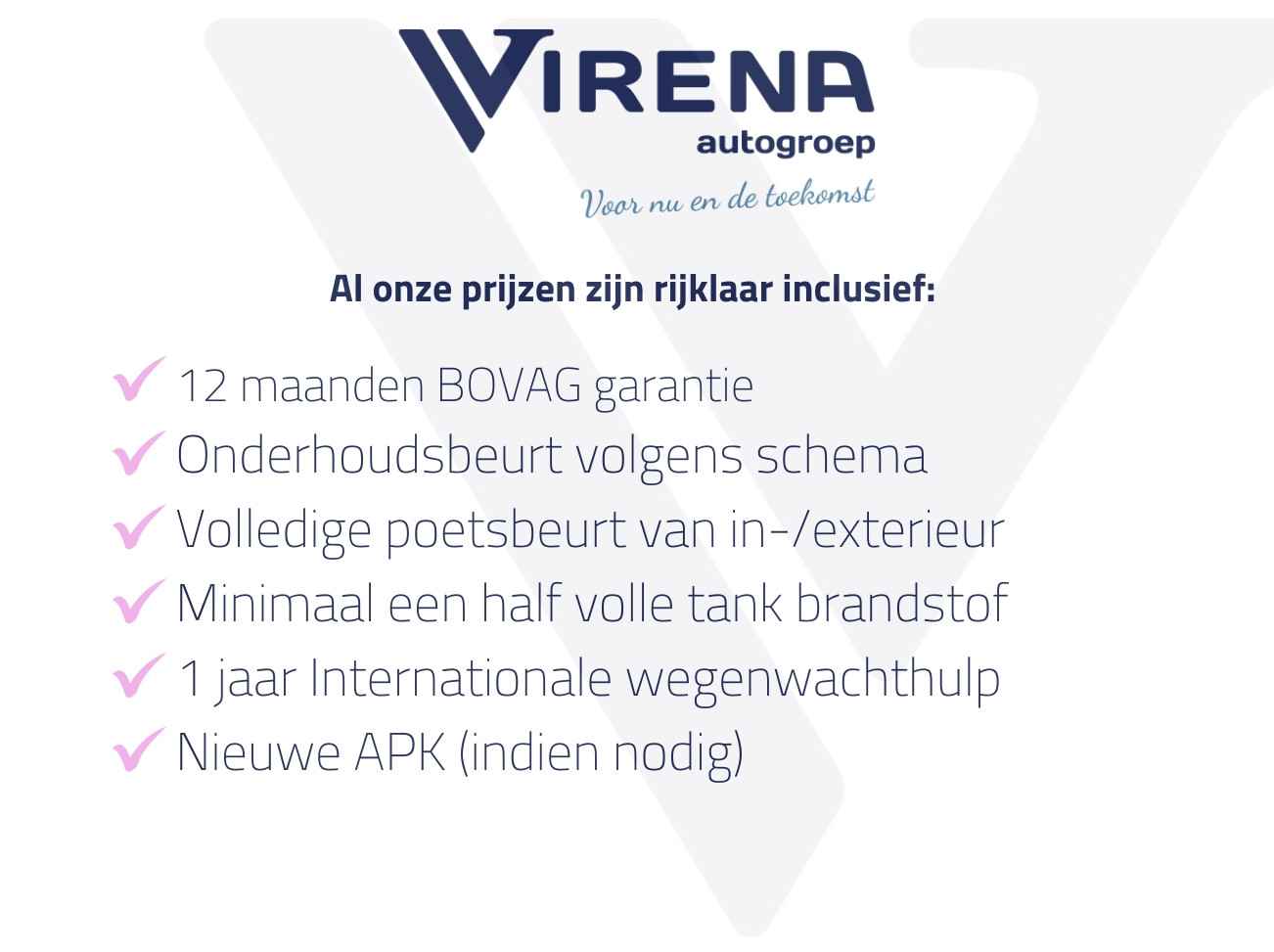 Jouw maandbedrag is afhankelijk van meerdere factoren. Onze vanafprijs is berekend op basis van een looptijd van 60 mnd, 10.000km/jr, een vooruitbetaling t.w.v. 3000,- en 8 schadevrije jaren op je autoverzekering. Vraag daarom een offerte aan en ontdek jouw persoonlijke maandbedrag.