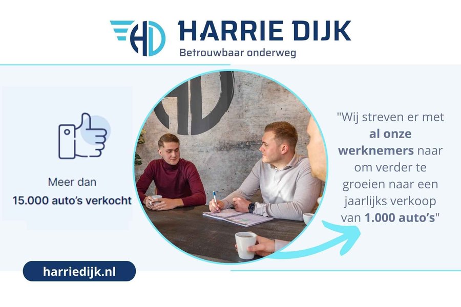 Bent u enthousiast geworden over deze auto? Wij nodigen u van harte uit om bij ons in Hellendoorn om een proefrit te maken. De auto’s van Autobedrijf Harrie Dijk worden tegen de scherpst mogelijk prijs aangeboden. Wij zijn volledig transparant over hetgeen waarvoor u betaald. Ons zekerheidspakket zorgt ervoor dat de auto naar wens wordt afgeleverd. Bij ons heeft u de keuze of u de auto wil laten afleveren met een beurt volgens fabrieksschema en of u gebruik wil maken van 1 jaar BOVAG-garantie. Bij garantie heeft u recht op onze “Dichtbij Garantie Service”. Woont u niet in de gemeente Hellendoorn of omstreken, dan kunt u de auto bij u in de buurt laten repareren. De kosten zijn dan uiteraard voor ons rekening. Wij kunnen u ook helpen bij het volgende: - Inruilauto (online) laten taxeren - Financieringsaanvraag - Private lease aanvraag - Financial lease aanvraag (zakelijk) - Operational lease aanvraag (zakelijk) Wil je wat meer weten over ons bedrijf? Autobedrijf Harrie Dijk is sinds 1992 een full-service autobedrijf met inmiddels een voorraad van ruim 100 auto’s. Het gaat hier vaak om zeer jong gebruikte occasions. Deze auto’s hebben een volledig bekend historie, komen meestal van de eerste eigenaar en zijn dealeronderhouden. Wij zijn een enthousiast familiebedrijf met de service van een dorpsgarage met als doel een jaarlijkse verkoop van 1.000 auto’s. Benieuwd naar hoe onze klanten een aankoop bij ons ervaren? Bekijk dan eens onze onafhankelijke reviews op de website. Hier zijn wij vanzelfsprekend enorm trots op. Liever eerst contact via Whatsapp? Neem dan contact op via: +31 657929380 of gebruik de volgende link: https://wa.me/31657929380 Disclaimer: deze advertentie m.b.t. opties en specificaties van deze auto hebben wij met zorg samengesteld. Voor eventuele fouten willen wij ons excuseren. Hier kunnen echter geen rechten aan worden ontleend.
