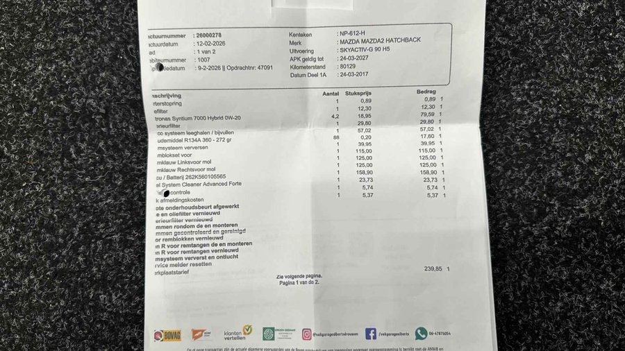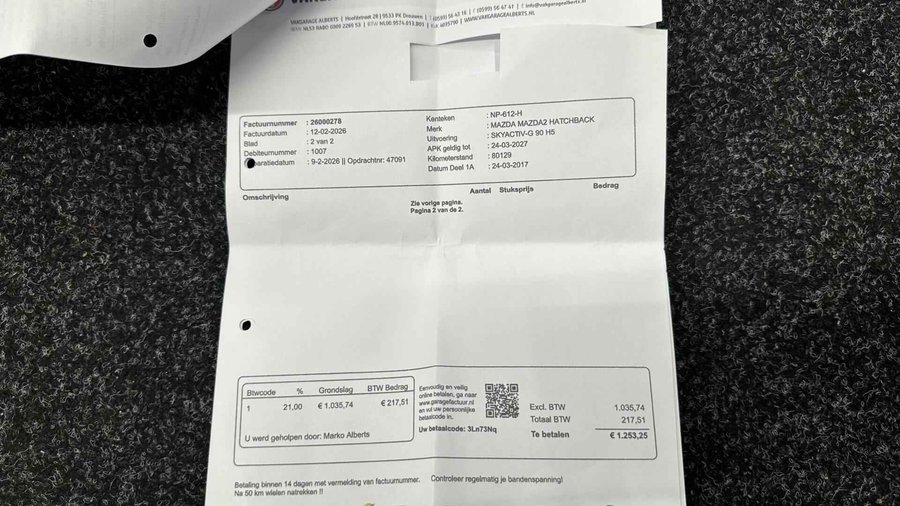 Mazda 2 1.5 Skyactiv-G TS TREKHAAK NAVI CRUISE LM ECC 80000 KM . - Kenteken: NP-612-H - Merk: Mazda - Model: 2 - APK tot: 24-03-2027 - Tellerstand: 80693 KM - Carrosserievorm: Hatchback - Aantal deuren: 5 - Brandstofsoort: Benzine - Bouwjaar: 2017 - Transmissie: Handgeschakeld - Kleur: bruin - Bekleding: Stof - Kleur interieur: zwart - Motorinhoud: 1496 cc - Aantal cilinders: 4 - Motorcode: P5 - Vermogen: 66 kW / 90pk - Ledig gewicht: 950 kg - Max. trekgewicht: 900 kg - Aantal zitplaatsen: 5 - Verbruik: 4.5 l/100 km - BTW/Marge: Marge, de BTW is niet aftrekbaar - Lengte: 406 cm - Breedte: 170 cm - Hoogte: 1495 cm - Aantal sleutels: 2 - Onderhoudshistorie aanwezig: Ja - Motorrijtuigenbelasting: € 92 - 99 per kwartaal - Emissieklasse: Euro 6 Comfort - Boordcomputer - Cruise control - Regensensor Exterieur - Achterruitwisser - Buitenspiegel rechts - Buitenspiegels elektrisch verstelbaar - Buitenspiegels verwarmbaar - Centrale vergrendeling met afstandsbediening - Dimlichten automatisch - Getint glas - Lichtmetalen velgen 15” - Metaalkleur - Park Distance Control - Parkeersensor achter - Sportvelgen - Trekhaak Infotainment - Multimedia-voorbereiding - Navigatiesysteem - Radio - Radio-CD/MP3 speler - Stuur multifunctioneel Interieur - Achterbank in delen neerklapbaar - Airco - Airco automatisch - Bestuurdersstoel in hoogte verstelbaar - Elektrische ramen voor en achter - Microvezel bekleding - Stuur en versnellingspook (kunst)leder - Stuur verstelbaar - Stuurbekrachtiging - Voorstoelen verwarmd Milieu - Start/stop systeem Overige - Anti Blokkeer Systeem - Anti doorSlip Regeling - Bestuurdersairbag - Bluetooth - Brake Assist System - Elektronisch Stabiliteits Programma - Elektronische remkrachtverdeling - Hoofd airbag(s) achter - Hoofd airbag(s) voor - Passagiersairbag - Zij airbag(s) voor Veiligheid - Alarm klasse 1(startblokkering) - Bandenspanningscontrolesysteem - Isofix bevestiging voor kinderzitjes Deze zeer gunstig geprijsde Mazda 2 is zonder overdrijven echt een fantastische occasion. Hij heeft een benzinemotor en een handgeschakelde versnellingsbak. Winterse omstandigheden? Geniet dan van het comfort van de stoelverwarming! Bij de rijke uitrusting horen ook getint glas en in delen neerklapbare achterbank. Audiosysteem en navigatiesysteem zijn gecombineerd. Zo wordt zelfs gesproken route-informatie een luisterervaring! En dankzij bluetooth klinkt uw favoriete playlist geweldig. Met automatische airconditioning hoeft u alleen de gewenste temperatuur in te stellen. Het systeem doet de rest. Parkeerplekken worden er niet ruimer op. Maar met de aanwezige parkeersensoren krijgt u deze Mazda 2 zonder problemen op z'n plaats. De auto neemt u werk uit handen doordat hij zelf veel in de gaten houdt. Een regensensor en een automatisch inschakelbare verlichting nemen waar wanneer de ruitenwissers en het licht aan moeten. Deze Mazda is bovendien voorzien van cruise control. Dus comfortabel en zuinig rijden verzekerd! Deze auto is voorzien van isofix-aansluiting, centrale deurvergrendeling met afstandsbediening, boordcomputer en verstelbaar stuur. De nieuwste veiligheidssystemen komen in deze Mazda 2 samen. Brake assist verhoogt de remdruk in een noodsituatie zodat u sneller stil staat. Wij kunnen ons goed voorstellen dat u deze Mazda wilt aanschaffen. Wacht daar dan niet mee en reserveer hem nu direct. Dan nemen wij zo snel mogelijk contact met u op om de aflevering te bespreken. U kunt deze deze auto financieren vanaf €249,00 per maand. Voor meer vragen of informatie kunt u ons altijd bellen mailen of smsen. Kijk ook eens naar onze andere voordelige advertenties. Onze garantie/rijklaar pakketten Instapgarantie (€399,-) Auto's van 10 - 15 jaar oud en tot 175.000 km. Inclusief: 12 maand garantie. Nieuwe APK. Algehele check. Kleine onderhoudsbeurt. Excellent garantie (€499,-) Auto's tot 10 jaar oud en tot 175.000 km. Inclusief: 12 maand garantie. Nieuwe APK. Algehele check. Kleine onderhoudsbeurt. Excellent plus garantie (€699,-) Auto's tot 10 jaar oud en tot 175.000 km. Inclusief: 12 maand garantie. Nieuwe APK. Algehele check. Grote onderhoudsbeurt. Exclusive garantie (€1499,-) Speciaal voor onze exclusives. Auto's tot 10 jaar oud en tot 175.000 km. Inclusief: 12 maand garantie Nieuwe APK. Algehele check Inclusief onderhoudsbeurt. Onze advertenties worden met grote zorgvuldigheid op het internet geplaatst. Mocht er onverhoopt toch een fout in staan, dan kan hieraan geen rechten worden ontleend.  Financiering is mogelijk. Whatsapp ons op:  06-552 318 32 RTO autoservice Zuiderdiep 408 7876 AW Valthermond 0599 72 70 12 info@rtoautoservice.nl www.rtoautoservice.nl/