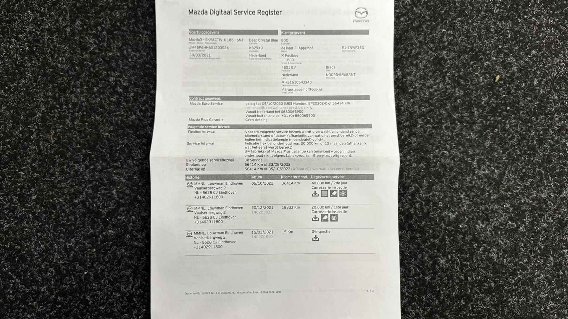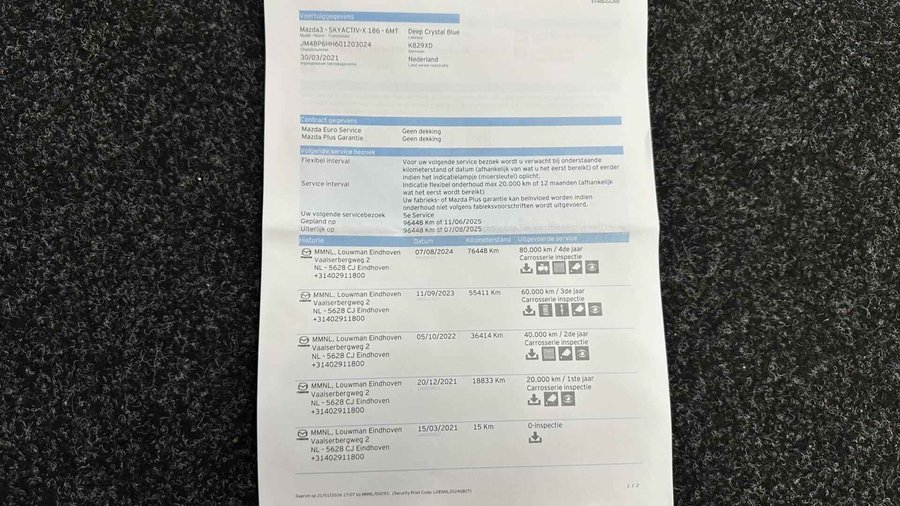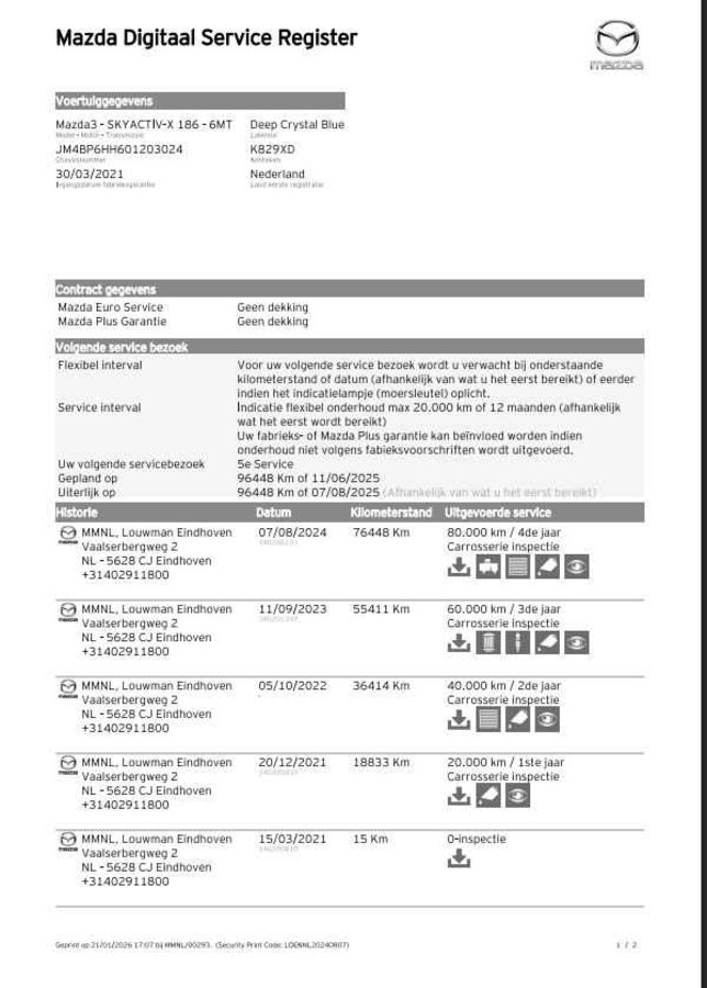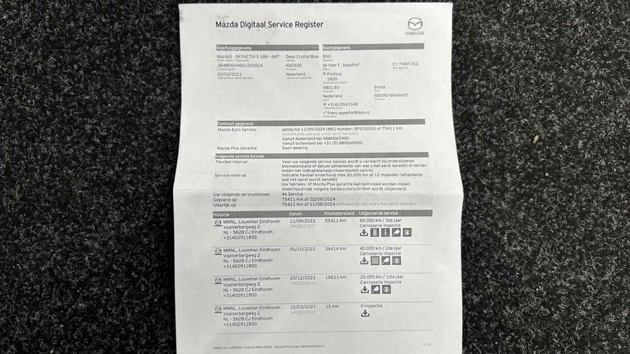 Mazda 3 2.0 e-SkyActiv-X M Hybrid 186 Comfort NAVI TREKHAAK CRUISE - Kenteken: K-829-XD - Merk: Mazda - Model: 3 - APK tot: 30-03-2027 - Tellerstand: 90924 KM - Carrosserievorm: Hatchback - Aantal deuren: 5 - Brandstofsoort: Benzine - Bouwjaar: 2021 - Transmissie: Handgeschakeld - Kleur: blauw - Bekleding: Stof - Kleur interieur: zwart - Motorinhoud: 1998 cc - Aantal cilinders: 4 - Motorcode: HF - Vermogen: 137 kW / 187pk - Ledig gewicht: 1338 kg - Max. trekgewicht: 1300 kg - Aantal zitplaatsen: 5 - Verbruik: 4.7 l/100 km - BTW/Marge: BTW aftrekbaar, de prijs is inclusief BTW - Lengte: 446 cm - Breedte: 180 cm - Hoogte: 1435 cm - Aantal sleutels: 2 - Onderhoudshistorie aanwezig: Ja - Motorrijtuigenbelasting: € 199 - 217 per kwartaal - Emissieklasse: Euro 6 Comfort - Boordcomputer - Regensensor Exterieur - Achterruitwisser - Achterspoiler - Buitenspiegel rechts - Buitenspiegel(s) automatisch dimmend - Buitenspiegels elektrisch inklapbaar - Buitenspiegels elektrisch verstelbaar - Buitenspiegels verwarmbaar - Centrale vergrendeling - Chroom delen exterieur - Dakspoiler - Dimlichten automatisch - Getint glas - Keyless entry - Koplampreiniging - LED achterlichten - LED koplampen - Lichtmetalen velgen 16" - Metaalkleur - Park Distance Control - Parkeersensor achter - Parkeersensor voor - Sportvelgen - Trekhaak met afneembare kogel Infotainment - DAB - Head-up display - Multimedia-voorbereiding - Navigatiesysteem - Navigatiesysteem full map - Radio - Stuur multifunctioneel Interieur - Achterbank in delen neerklapbaar - Airco - Armsteun voor - Bestuurdersstoel in hoogte verstelbaar - Binnenspiegel automatisch dimmend - Cruise control adaptief - Electronic climate control - Elektrische ramen voor - Elektrische ramen voor en achter - Lederen versnellingspook - Microvezel bekleding - Middenarmsteun voor - Passagiersstoel in hoogte verstelbaar - Stuur leder - Stuur verstelbaar - Stuur verwarmd - Stuurbekrachtiging - Voorstoelen verwarmd Overige - Achteruitrij assistent - Anti Blokkeer Systeem - Anti doorSlip Regeling - Automatische snelheidsbegrenzing ISA - Autonomous Emergency Braking - Bestuurdersairbag - Bluetooth - Bots waarschuwing systeem - Brake Assist System - Connected services - Dodehoek detectie - Elektronisch Stabiliteits Programma - Elektronische remkrachtverdeling - Hemelbekleding donker - Hoofd airbag(s) achter - Hoofd airbag(s) voor - Keyless start - Knie airbag(s) - Multimedia scherm standaard - Passagiersairbag - Rijstrooksensor met correctie - Zij airbag(s) voor Veiligheid - Alarm klasse 1(startblokkering) - Alarmsysteem - Bandenspanningscontrolesysteem - Grootlichtassistent - Hill hold functie - Isofix bevestiging voor kinderzitjes - Verkeersbord detectie - Vermoeidheids herkenning Het eigentijdse ontwerp en de toonaangevende techniek maken van iedere Japanse auto een kwaliteitsproduct. Dat is ook te merken aan deze Mazda 3. Hij heeft een benzinemotor en een handgeschakelde versnellingsbak. Deze Mazda 3 heeft verwarmbare voorstoelen, voor zowel bestuurder als bijrijder. Verder is de Mazda uitgerust met: 16 inch lichtmetalen velgen, LED koplampen, dakspoiler, getint glas, in delen neerklapbare achterbank en LED-achterlichten. Als u de adaptive cruise control inschakelt, regelt de auto zelf de snelheid en de afstand tot de auto voor u. Als u regelmatig met een aanhanger of een fietsendrager op pad bent, is de afneembare trekhaak een praktische extra. Ingericht op Connected Services, voor een nog veiligere en comfortabelere rit. Het navigatiesysteem zorgt ervoor dat u altijd de juiste en snelste route vindt. Dankzij electronic climate control is het interieur behaaglijk warm of verfrissend koel. Ook is de Mazda uitgerust met: DAB ontvangst, parkeersensoren achter, regensensor, keyless entry, automatisch dimmende buitenspiegels en lederen stuur. Elektronische veiligheidsvoorzieningen helpen u onderweg om de situatie op de weg te beoordelen. Deze systemen waarschuwen u als er een riskante situatie ontstaat, en kunnen in bepaalde gevallen ook zelf ingrijpen. Veiligheid voor alles, ook als u rij- en routeinformatie wilt aflezen. De head-up display projecteert de gegevens op de vooruit en u kunt gewoon voor u blijven kijken. Verkeersborddetectie herkent tijdelijke en permanente verkeersborden langs en boven de weg. Met het Lane-keeping systeem gaat u nooit onbedoeld over de streep. Bovenop deze veiligheidsfeatures heeft deze Mazda bovendien dodehoekdetectie, forward collision warning system, hill hold functie, brake assist, vermoeidheidsherkenning en bandenspanningcontrolesysteem. Meer weten? Neem nu contact met ons op voor een afspraak. U kunt deze deze auto financieren vanaf €399,00 per maand. Voor meer vragen of informatie kunt u ons altijd bellen mailen of smsen. Kijk ook eens naar onze andere voordelige advertenties. Onze garantie/rijklaar pakketten Instapgarantie (€399,-) Auto's van 10 - 15 jaar oud en tot 175.000 km. Inclusief: 12 maand garantie. Nieuwe APK. Algehele check. Kleine onderhoudsbeurt. Excellent garantie (€499,-) Auto's tot 10 jaar oud en tot 175.000 km. Inclusief: 12 maand garantie. Nieuwe APK. Algehele check. Kleine onderhoudsbeurt. Excellent plus garantie (€699,-) Auto's tot 10 jaar oud en tot 175.000 km. Inclusief: 12 maand garantie. Nieuwe APK. Algehele check. Grote onderhoudsbeurt. Exclusive garantie (€1499,-) Speciaal voor onze exclusives. Auto's tot 10 jaar oud en tot 175.000 km. Inclusief: 12 maand garantie Nieuwe APK. Algehele check Inclusief onderhoudsbeurt. Onze advertenties worden met grote zorgvuldigheid op het internet geplaatst. Mocht er onverhoopt toch een fout in staan, dan kan hieraan geen rechten worden ontleend.  Financiering is mogelijk. Whatsapp nummer voor:  RTO Autoservice Stadskanaal 06-11 86 66 32 Whatsapp nummer voor: RTO Exclusive 06- 25 37 00 90 RTO Autoservice Stadskanaal Veenstraat 3 9502EZ Stadskanaal 0599727012 stadskanaal@rtoautoservice.nl www.rtoautoservice.nl
