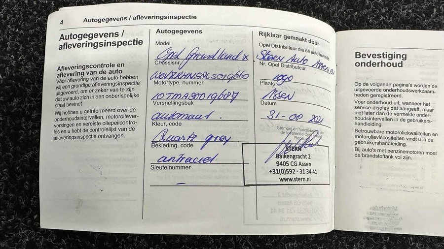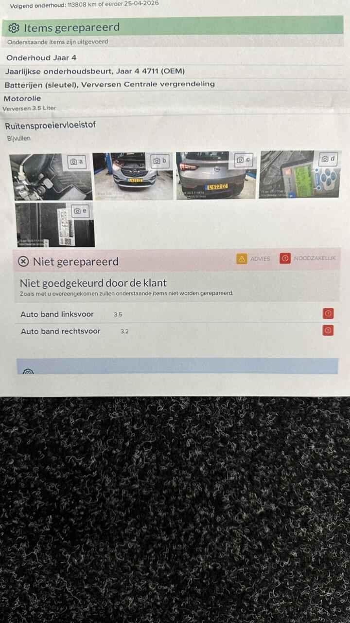 Opel Grandland X 1.2 Turbo Business Executive CAMERA CARPLAY LM NAVI ECC CRUISE. - Kenteken: L-622-ZZ - Merk: Opel - Model: Grandland X - APK tot: 31-08-2027 - Tellerstand: 107253 KM - Carrosserievorm: SUV - Aantal deuren: 5 - Brandstofsoort: Benzine - Bouwjaar: 2021 - Transmissie: Automaat - Kleur: grijs - Bekleding: Leder/Stof - Kleur interieur: zwart - Motorinhoud: 1199 cc - Aantal cilinders: 3 - Motorcode: HN05 - Vermogen: 96 kW / 131pk - Ledig gewicht: 1295 kg - Max. trekgewicht: 1300 kg - Aantal zitplaatsen: 5 - Verbruik: 4.9 l/100 km - BTW/Marge: BTW aftrekbaar, de prijs is inclusief BTW - Lengte: 448 cm - Breedte: 186 cm - Aantal sleutels: 2 - Onderhoudshistorie aanwezig: Ja - Motorrijtuigenbelasting: € 192 - 211 per kwartaal - Emissieklasse: Euro 6 Pakket: Open & Start - Elektrisch bedienbare achterklep met sensorsturing - Keyless entry - Keyless start Pakket: Stoelen pakket - Comfortstoel(en) - Lendesteun(en) verstelbaar Comfort - Boordcomputer - Cruise control - Regensensor Exterieur - Achterruitwisser - Buitenspiegel rechts - Buitenspiegels elektrisch inklapbaar - Buitenspiegels elektrisch verstelbaar - Buitenspiegels in carrosseriekleur - Buitenspiegels met verlichting - Buitenspiegels verwarmbaar - Centrale vergrendeling met afstandsbediening - Chroom delen exterieur - Dimlichten automatisch - Extra getint glas achter - Keyless entry - LED achterlichten - LED dagrijverlichting - LED koplampen - Lichtmetalen velgen 17" - Metaalkleur - Park Distance Control - Parkeersensor achter - Parkeersensor voor Infotainment - Audio installatie - DAB - Multimedia-voorbereiding - Navigatiesysteem full map - Radio - Spraakbediening - Stuur multifunctioneel Interieur - Achterbank in delen neerklapbaar - Airco - Armsteun achter - Armsteun voor - Bestuurdersstoel in hoogte verstelbaar - Binnenspiegel automatisch dimmend - Comfortstoel(en) - Electronic climate control - Elektrische ramen achter - Elektrische ramen voor - Kunstlederen/stof bekleding - Lendesteun(en) verstelbaar - Microvezel bekleding - Middenarmsteun voor - Passagiersstoel in hoogte verstelbaar - Stuur leder - Stuur verstelbaar - Stuurbekrachtiging snelheidsafhankelijk Milieu - Start/stop systeem Overige - Anti Blokkeer Systeem - Apple Carplay/Android Auto - Autonomous Emergency Braking - Bestuurdersairbag - Bluetooth - Bots waarschuwing systeem - Connected services - Dodehoek detectie - Elektrisch bedienbare achterklep met sensorsturing - Elektronisch Stabiliteits Programma - Hoofd airbag(s) achter - Hoofd airbag(s) voor - Keyless start - Passagiersairbag - Zij airbag(s) voor Veiligheid - Achteruitrijcamera - Alarm klasse 1(startblokkering) - Bandenspanningscontrolesysteem - Grootlichtassistent - Hill hold functie - Isofix bevestiging voor kinderzitjes - Verkeersbord detectie - Vermoeidheids herkenning Opel ziet al jaren kans om een brede groep klanten aan te spreken zonder concessies te doen aan vernieuwing en vooruitstrevende keuzes. De kreet 'De toekomst is voor iedereen' gaat meer dan ooit op. Deze Opel heeft een benzinemotor die zuinig is, maar toch hoge prestaties levert. De comfortstoelen zitten op lange ritten zo prettig dat u bijna vergeet te pauzeren. Met een druk op de knop gaat de elektrische achterklep open. Natuurlijk behoren 17 inch lichtmetalen velgen, LED koplampen, donker getint glas achter, in delen neerklapbare achterbank, LED-achterlichten en verstelbare lendensteunen ook tot de uitrusting van deze complete auto. Een vergeten muurtje, een verborgen paaltje? Dat gebeurt niet meer, dankzij de achteruitrijcamera. Net als een smartphone of een slimme speaker kunt u deze auto bedienen met stemcommando's. Hoe is het met de banden, de accu en andere onderdelen? Connected Services maakt het inzichtelijk, 24/7 via de app. Zorgeloos en geconcentreerd rijden? Het full map navigatiesysteem wijst de weg! Ook is de auto voorzien van electronic climate control. De Opel is standaard voorzien van: DAB ontvangst, regensensor, cruise control, keyless entry, automatisch dimmende binnenspiegel en lederen stuur. Zoals u mag verwachten van deze Opel Grandland X is hij uitgerust met een reeks aan actieve veiligheidssystemen. Wat deze auto ook kan, is lezen. Hij 'leest' voor u de verkeersborden tijdens de rit en attendeert u erop door ze op het dashboard te projecteren. De forward collision warning geeft een botswaarschuwing als een aanrijding dreigt met een voorligger. Vermoeidsheidsherkenning herkent tekenen van vermoeidheid bij de bestuurder. Het systeem voorkomt dat er ongelukken gebeuren doordat de bestuurder in slaap valt. Met voorzieningen als dodehoekdetectie, hill hold functie, autonoom remsysteem en bandenspanningcontrolesysteem, bent u altijd veilig onderweg. Een proefrit maken met deze Opel Grandland X? Natuurlijk! Bel even voor een afspraak! U kunt deze deze auto financieren vanaf €349,00 per maand. Voor meer vragen of informatie kunt u ons altijd bellen mailen of smsen. Kijk ook eens naar onze andere voordelige advertenties. Onze garantie/rijklaar pakketten Instapgarantie (€399,-) Auto's van 10 - 15 jaar oud en tot 175.000 km. Inclusief: 12 maand garantie. Nieuwe APK. Algehele check. Kleine onderhoudsbeurt. Excellent garantie (€499,-) Auto's tot 10 jaar oud en tot 175.000 km. Inclusief: 12 maand garantie. Nieuwe APK. Algehele check. Kleine onderhoudsbeurt. Excellent plus garantie (€699,-) Auto's tot 10 jaar oud en tot 175.000 km. Inclusief: 12 maand garantie. Nieuwe APK. Algehele check. Grote onderhoudsbeurt. Exclusive garantie (€1499,-) Speciaal voor onze exclusives. Auto's tot 10 jaar oud en tot 175.000 km. Inclusief: 12 maand garantie Nieuwe APK. Algehele check Inclusief onderhoudsbeurt. Onze advertenties worden met grote zorgvuldigheid op het internet geplaatst. Mocht er onverhoopt toch een fout in staan, dan kan hieraan geen rechten worden ontleend.  Financiering is mogelijk. Whatsapp ons op:  06-552 318 32 RTO autoservice Zuiderdiep 408 7876 AW Valthermond 0599 72 70 12 info@rtoautoservice.nl 