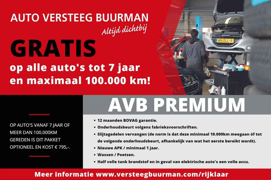 GRATIS  ''AVB Premium'' pakket inbegrepen op auto's tot 7 jaar en maximaal 100.000km Hiervoor wordt de auto zeer uitgebreid geleverd inclusief: - 12 maanden BOVAG garantie - Onderhoudsbeurt volgens fabrieksvoorschriften. - Slijtagedelen vervangen (de norm is dat deze minimaal 10.000km meegaan óf tot de volgende onderhoudsbeurt, afhankelijk van wat het eerste bereikt wordt). - Nieuwe APK / minimaal 1 jaar. - Wassen / Poetsen. - Half volle tank brandstof en in geval van elektrische auto's een volle accu. Meer informatie en veelgestelde vragen kijk op: www.versteegbuurman.com/rijklaar Wilt u deze auto komen bewonderen? Bel 0342-413535 of mail naar verkoopbarneveld@versteegbuurman.com. U bent van harte welkom!