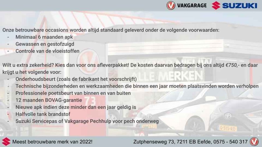 Auto Service Eefde is al ruim 30 jaar de Suzuki dealer voor de regio Zutphen en sinds 2011 daarnaast ook Vakgarage. Kwalitatief, persoonlijk en met oog voor detail! Wij zorgen voor een goed onderhoud van uw auto en geven u gedegen advies bij het aanschaffen van een nieuwe of gebruikte Suzuki, maar ook van ieder ander merk. In onze showroom hebben wij diverse Suzuki modellen staan en in onze werkplaats kunt u terecht voor service en onderhoud. Onze monteurs zijn stuk voor stuk gekwalificeerd en echte experts waarbij veel waarde wordt gehecht aan persoonlijke aandacht en een goede service. Daarnaast is onze werkplaats ook geschikt voor onderhoud en reparatie van campers. Of het nou de verkoper, receptionist of de directeur is, voor iedereen binnen Auto Service Eefde geldt: de klant en de behoeften van de klant staan centraal..