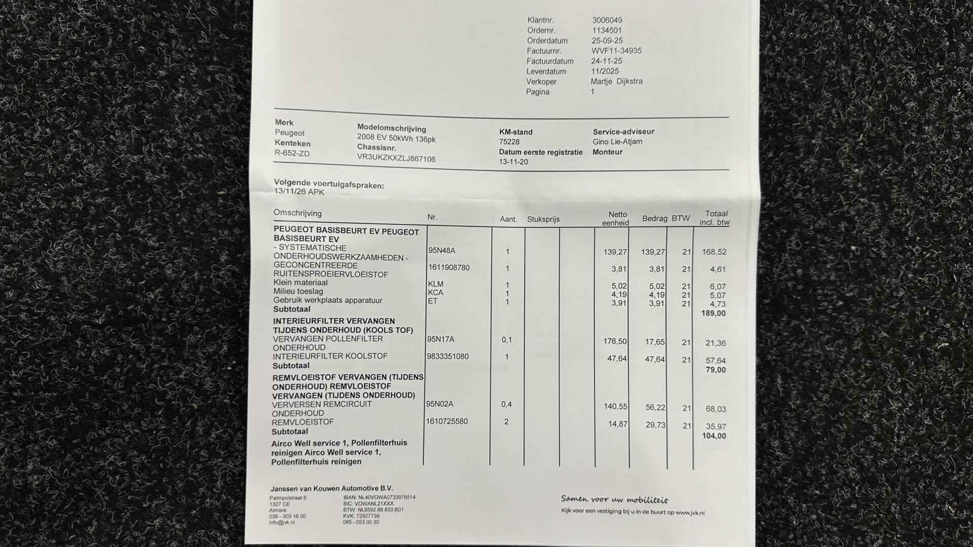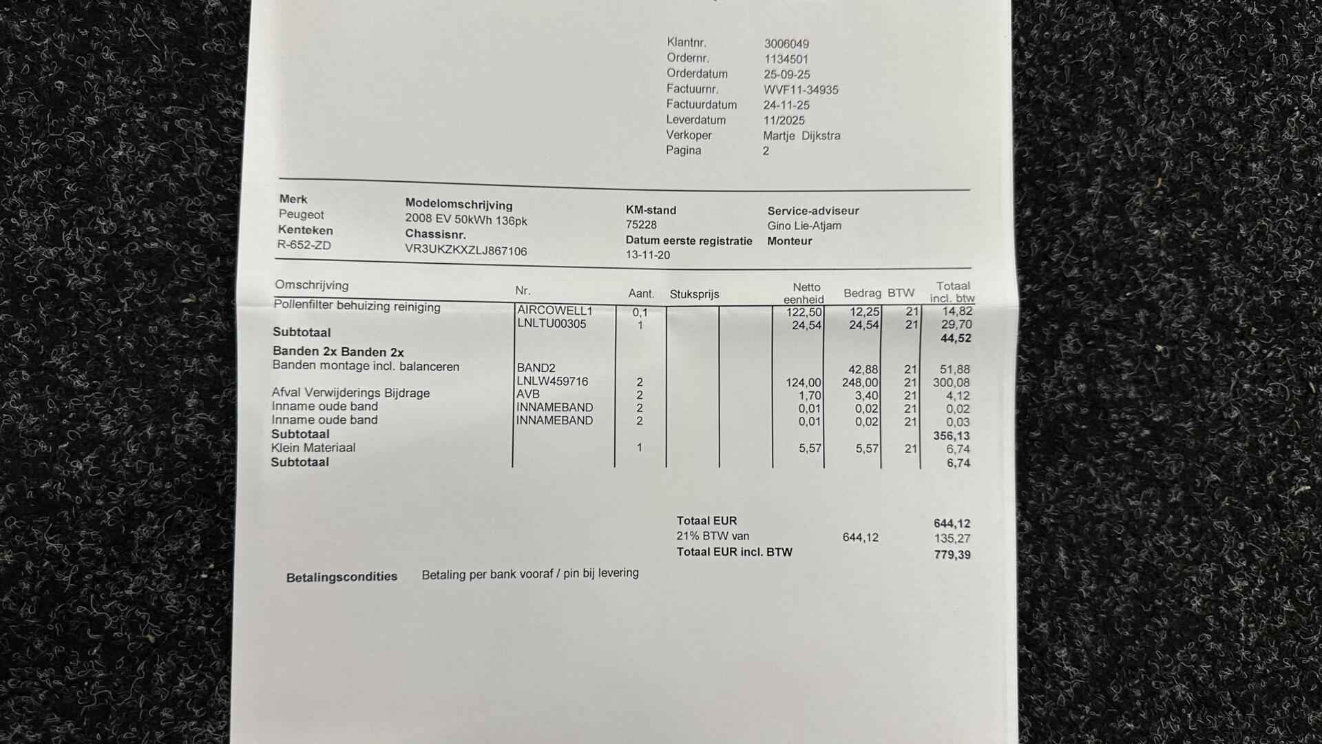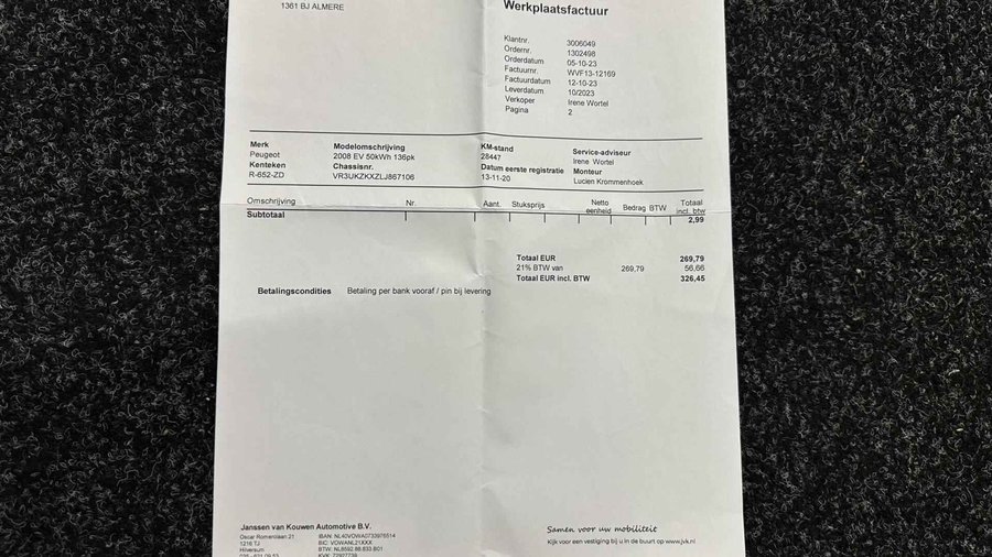 Peugeot e-2008 EV Active 50 kWh CAMERA CARPLAY NAVI ECC CRUISE. - Kenteken: R-652-ZD - Merk: Peugeot - Model: e-2008 - APK tot: 11-03-2028 - Tellerstand: 79838 KM - Carrosserievorm: SUV - Aantal deuren: 5 - Brandstofsoort: Elektrisch - Accucapaciteit: 50 kWh - Actieradius: 330 km - Aantal laadfasen: 3-fasen - Bouwjaar: 2020 - Transmissie: Automaat - Kleur: grijs - Bekleding: Stof - Motorcode: ZK01 - Vermogen: 100 kW / 136pk - Ledig gewicht: 1523 kg - Aantal zitplaatsen: 5 - BTW/Marge: Marge, de BTW is niet aftrekbaar - Lengte: 430 cm - Breedte: 177 cm - Aantal sleutels: 2 - Onderhoudshistorie aanwezig: Ja - Motorrijtuigenbelasting: € 177 - 193 per kwartaal - Emissieklasse: Euro Z Comfort - Cruise control - Regensensor Exterieur - Achterruitwisser - Buitenspiegel rechts - Buitenspiegels elektrisch verstelbaar - Buitenspiegels in carrosseriekleur - Buitenspiegels verwarmbaar - Centrale vergrendeling met afstandsbediening - Dakrails - Dimlichten automatisch - Getint glas - LED achterlichten - LED dagrijverlichting - LED koplampen - Metaalkleur - Park Distance Control - Parkeersensor achter - Speciale kleur - Sportvelgen Infotainment - DAB - Multimedia-voorbereiding - Navigatiesysteem full map - Radio - Spraakbediening - Stuur multifunctioneel Interieur - Achterbank in delen neerklapbaar - Airco automatisch - Bestuurdersstoel in hoogte verstelbaar - Binnenspiegel automatisch dimmend - Elektrische ramen achter - Elektrische ramen voor - Microvezel bekleding - Middenarmsteun voor - Stuur leder - Stuurbekrachtiging - Voorstoelen verwarmd Overige - Anti Blokkeer Systeem - Apple Carplay/Android Auto - Autonomous Emergency Braking - Bestuurdersairbag - Bluetooth - Bots waarschuwing systeem - Connected services - Elektronisch Stabiliteits Programma - Hoofd airbag(s) achter - Hoofd airbag(s) voor - Keyless start - Oplaadmogelijkheid - Passagiersairbag - Rijstrooksensor met correctie - Zij airbag(s) voor Veiligheid - Achteruitrijcamera - Alarm klasse 1(startblokkering) - Alarmsysteem - Bandenspanningscontrolesysteem - Isofix bevestiging voor kinderzitjes - Verkeersbord detectie - Vermoeidheids herkenning Een van de sterkste Franse merken, al tientallen jaren. Motion & Emotion, zeggen ze bij Peugeot. Bent u ook toe aan een auto met elektromotor? Goeie keuze! Lekker hoor, die verwarmbare voorstoelen. Helemaal op koude dagen. Ook is de auto voorzien van: LED koplampen, getint glas, in delen neerklapbare achterbank en LED-achterlichten. Ook achter de auto geen verrassingen bij het inparkeren. Daarvoor zorgt de achteruitrijcamera. Waar u zelf ook bent, u staat altijd in contact met de auto via de app op uw smartphone. Zo controleert u uiteenlopende functies, ook op afstand. Een belangrijke veiligheidsvoorziening is de bediening van het audiosysteem en het full map navigatiesysteem, via knoppen op het stuur en middels spraakbediening. DAB-ontvangst geeft daarbij een kraakheldere ontvangst. Nooit meer te warm of te koud. De automatische airconditioning zorgt altijd voor de temperatuur die u kiest. De auto neemt u werk uit handen doordat hij zelf veel in de gaten houdt. Een regensensor en een automatisch inschakelbare verlichting nemen waar wanneer de ruitenwissers en het licht aan moeten. Ook cruise control, automatisch dimmende binnenspiegel, lederen stuur, isofix-aansluiting en centrale deurvergrendeling met afstandsbediening zijn aan boord. In de Peugeot e-2008 heeft uw veiligheid en die van uw omgeving prioriteit. Onderweg zorgt verkeersborddetectie ervoor dat u geen waarschuwingsbord mist. Een camera houdt de juiste koers binnen de rijstrook in de gaten en het Lane-keeping systeem corrigeert bij afwijkingen. Het forward collision warning-systeem waarschuwt indien een botsing dreigt met een voorliggend of tegemoetkomend voertuig. In deze Peugeot vinden we verder een vermoeidheidsherkenning, autonoom remsysteem en bandenspanningcontrolesysteem. Een proefrit? Natuurlijk! Neem contact op en we maken een afspraak om u te overtuigen van deze kwaliteitsauto! U kunt deze deze auto financieren vanaf €269,00 per maand. Voor meer vragen of informatie kunt u ons altijd bellen mailen of smsen. Kijk ook eens naar onze andere voordelige advertenties. Onze garantie/rijklaar pakketten Instapgarantie (€399,-) Auto's van 10 - 15 jaar oud en tot 175.000 km. Inclusief: 12 maand garantie. Nieuwe APK. Algehele check. Kleine onderhoudsbeurt. Excellent garantie (€499,-) Auto's tot 10 jaar oud en tot 175.000 km. Inclusief: 12 maand garantie. Nieuwe APK. Algehele check. Kleine onderhoudsbeurt. Excellent plus garantie (€699,-) Auto's tot 10 jaar oud en tot 175.000 km. Inclusief: 12 maand garantie. Nieuwe APK. Algehele check. Grote onderhoudsbeurt. Exclusive garantie (€1499,-) Speciaal voor onze exclusives. Auto's tot 10 jaar oud en tot 175.000 km. Inclusief: 12 maand garantie Nieuwe APK. Algehele check Inclusief onderhoudsbeurt. Onze advertenties worden met grote zorgvuldigheid op het internet geplaatst. Mocht er onverhoopt toch een fout in staan, dan kan hieraan geen rechten worden ontleend.  Financiering is mogelijk. Whatsapp ons op:  06-552 318 32 RTO autoservice Zuiderdiep 408 7876 AW Valthermond 0599 72 70 12 info@rtoautoservice.nl www.rtoautoservice.nl/