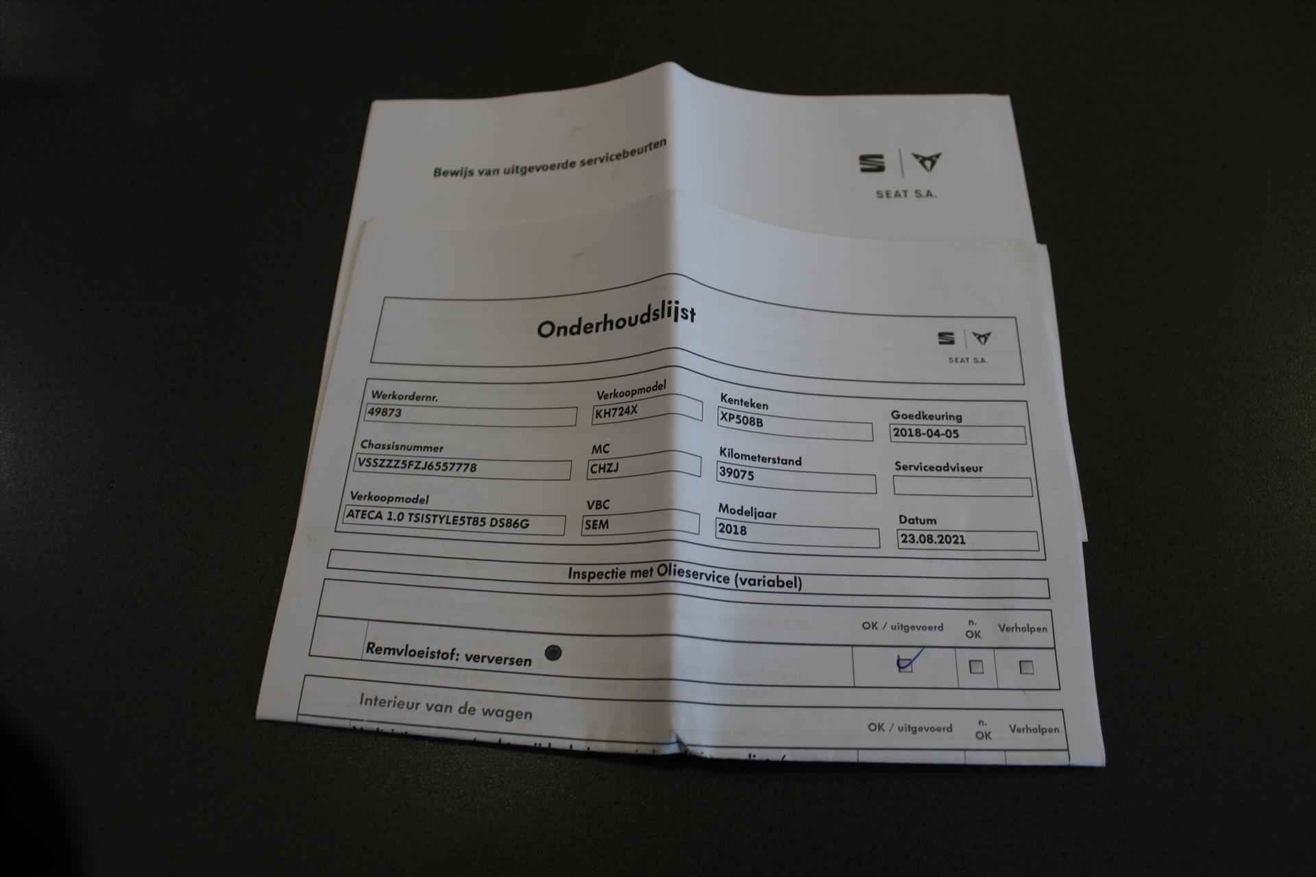 De getoonde prijs is inclusief APK en tenaamstelling, exclusief aanvullende garantie. Voor € 795,- extra (m.u.v. ViaBOVAG.nl) heeft u het aanvullende BOVAG-pakket *, bestaande uit: - 12 maanden BOVAG-garantie - Nieuwe APK - Grote onderhoudsbeurt; slijtage-onderdelen worden indien nodig vervangen - 12 maanden Vakgarage Pechhulp; vanuit huis, Nederland en Europa - Motorclean - 10% korting op volgend regulier onderhoud - Gratis vervangend vervoer in de garantieperiode (* op ViaBOVAG.nl is dit inclusief) *De Occasion-advertenties zijn met de grootste zorg opgesteld. Toch kan het onverhoopt voorkomen dat een advertentie niet volledig is of een fout bevat. Vertrouw daarom niet alleen op deze informatie, maar controleer bij aankoop de zaken die uw beslissing kunnen beïnvloeden. Derhalve kunnen we niet aansprakelijk gesteld worden voor mogelijke foutieve informatie Seat rijden is een kwestie van gevoel, gebouwd op vooruitstrevende techniek. Dat noemen ze nou auto emocion. Met zijn benzinemotor en handgeschakelde zesversnellingsbak is dit een prima auto voor nog vele kilometers. Een goede zithouding is wel zo prettig. Daarom is deze auto voorzien van comfortstoelen voorin. Bij de zeer complete uitrusting van deze auto behoren ook 17 inch lichtmetalen velgen, halogeen koplampen met LED-dagrijverlichting, elektrische handrem, zwarte dakrails, elektrisch inklapbare buitenspiegels en in delen neerklapbare achterbank. Het audiosysteem is niet alleen voorzien van een navigatiesysteem maar ook uitgerust met DAB-ontvanger, bleutooth en usb. Met climatronic airconditioning hoeft u alleen de gewenste temperatuur in te stellen. Het systeem doet de rest. De parkeersensoren waarschuwen wanneer u te krap inparkeert of dat ene paaltje niet hebt gezien. Kleine ritjes, grote reizen - altijd een relaxte aankomst dankzij de cruise control. Met multifunctioneel lederen stuur, buitentemperatuurmeter, hifi-luidsprekers, isofix-aansluiting, centrale deurvergrendeling met afstandsbediening en toerenteller is deze SEAT helemaal compleet. In de SEAT Ateca heeft uw veiligheid en die van uw omgeving prioriteit. Vermoeidheidsherkenning is een systeem dat met verschillende sensoren tekenen van vermoeidheid bij de chauffeur waarneemt. Deze krijgt tijdig een waarschuwing, wat ongelukken kan voorkomen. Bovenop deze veiligheidsfeatures heeft deze SEAT bovendien voetgangerherkenning, hill hold functie en bandenspanningcontrolesysteem. Bel nu voor een afspraak en overtuig uzelf.