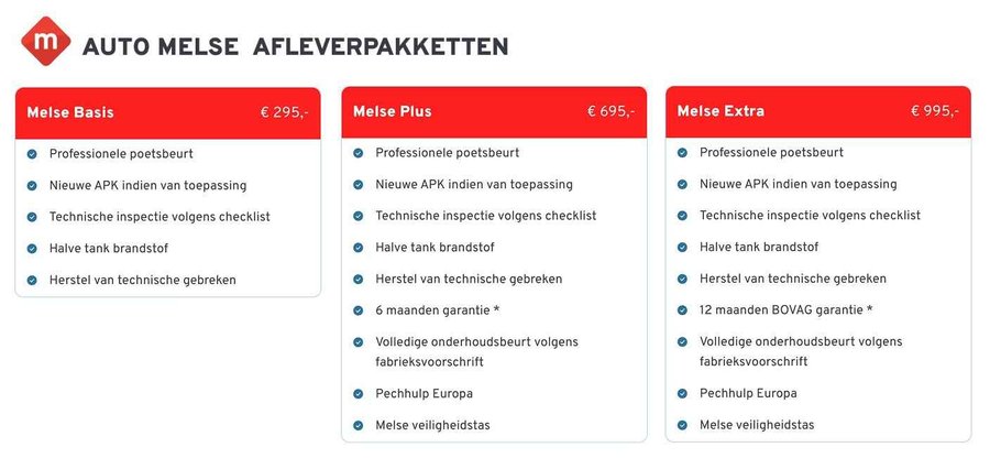 Van al onze occasions zijn de getoonde prijzen rijklaar, inclusief tenaamstellingskosten en geldige APK. Deze advertentie en de inhoud ervan is met de grootst mogelijke zorg samengesteld. Het is echter mogelijk dat de gehanteerde advertentietekst licht afwijkt van de opties/accessoires die werkelijk op de auto zitten. Er kunnen derhalve aan deze advertentie geen rechten worden ontleend. Auto Melse B.V. kan nooit aansprakelijk worden gesteld voor de inhoud en volledigheid van de verstrekte informatie. Voor vragen en/of meer informatie over de exacte uitvoering en beschikbaarheid van de auto waar u interesse in heeft, kunt u contact met ons verkoopteam opnemen!