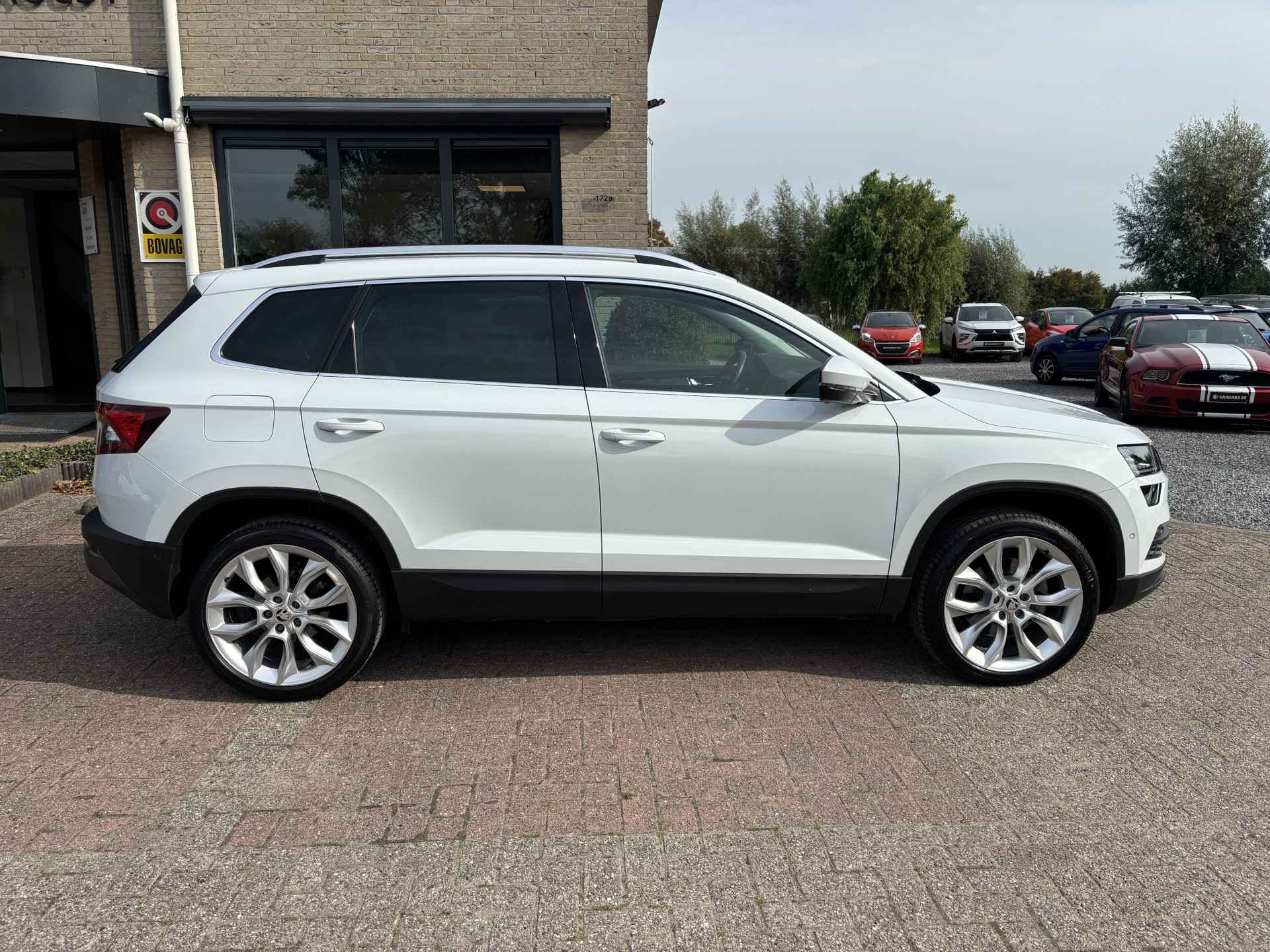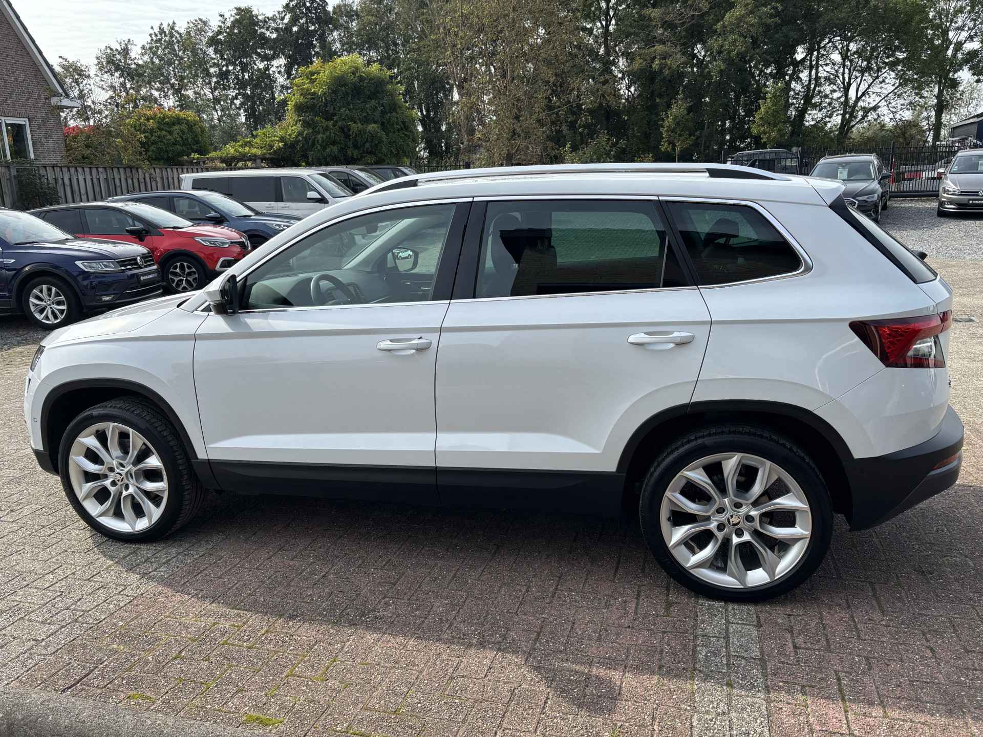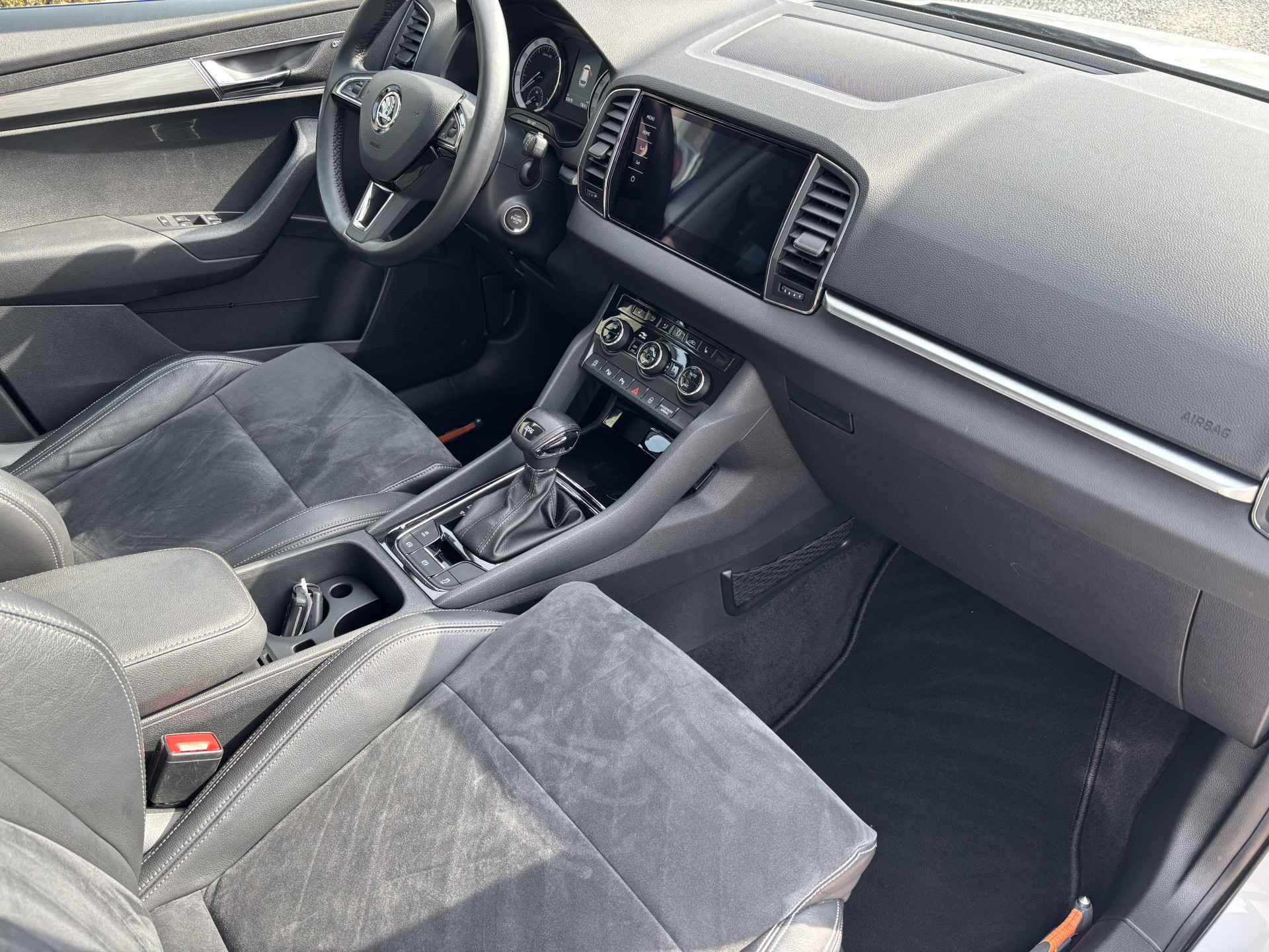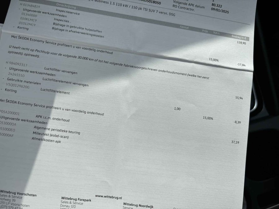 Origineel Nederlandse auto. 2e eigenaar auto. 2 sleutels + boekjes aanwezig. Nationale autopas en geldige APK. U kunt deze auto kopen voor de geadverteerde prijs, tevens heeft u keuze uit 2 afleverpakketten (zie het overzicht tussen de foto's). Inruil van uw huidige auto of motor is natuurlijk mogelijk. Bezichtiging en proefrit met afspraak mogelijk. De motorrijtuigenbelasting is +/- € 70,- per maand (afhankelijk van de provincie). Bent u op zoek naar een luxe, ruime en sportieve SUV met een hoge instap én hoge zitpositie? Dan is deze Skoda Karoq 1.5 TSI Style Business Automaat precies wat u zoekt! Onder de motorkap ligt een krachtige en betrouwbare 1.5 TSI turbomotor met 150 pk, gekoppeld aan de verfijnde en razendsnel schakelende 7-traps DSG automatische versnellingsbak. Dit zorgt voor een heerlijk soepele rijervaring – zowel in de stad als op de snelweg. De Karoq staat bekend om zijn zeer ruime interieur. Zelfs op de tweede zitrij kunnen lange volwassenen comfortabel zitten – ideaal voor gezinnen of zakelijke ritten. De hoge zit geeft een uitstekend overzicht op de weg en vergemakkelijkt het in- en uitstappen. Bovendien beschik je over een enorme kofferbak, perfect voor weekendjes weg of een grote boodschappentas. Deze uitvoering is tot de nok toe uitgerust met luxe en slimme technologie. De belangrijkste highlights: Panoramisch schuif-/kanteldak (elektrisch bedienbaar) – laat de zon binnen! Volledige LED-verlichting – beter zicht, modern uiterlijk 19” Lichtmetalen velgen – sportieve uitstraling Trekhaak (wegklapbaar) – onzichtbaar als je ‘m niet nodig hebt Adaptive Cruise Control – veilig én ontspannen rijden Keyless Entry & Start – nooit meer zoeken naar je sleutel Parkeersensoren voor + achter + parkeerhulp & achteruitrijcamera Climate Control (automatische airco) – altijd de juiste temperatuur Lederen/Alcantara bekleding + Sportstoelen + Stoelverwarming Elektrisch verstelbare bestuurdersstoel met geheugenfunctie Verwarmbare voorruit – geen krabben in de winter! Elektrische achterklep – met een druk op de knop open Lane Assist + Dodehoekdetectie – extra veiligheid onderweg Navigatiesysteem (full map) met groot touchscreen Bluetooth + DAB+ Radio + Premium Canton Audio – geniet van je favoriete muziek in topkwaliteit Deze Karoq combineert alles wat je zoekt in een moderne SUV: comfort, luxe, kracht, veiligheid en ruimte. Daarbij profiteer je van de degelijke bouwkwaliteit van Skoda én het rijplezier van de 1.5 TSI met DSG-automaat.