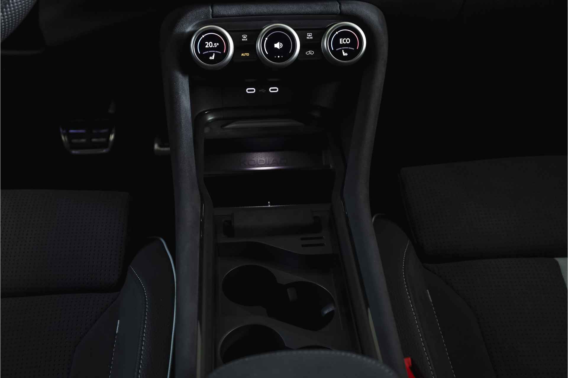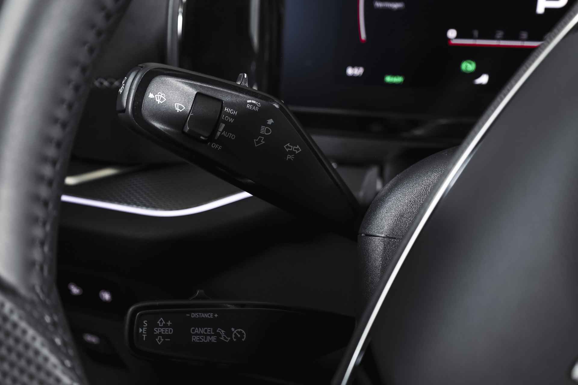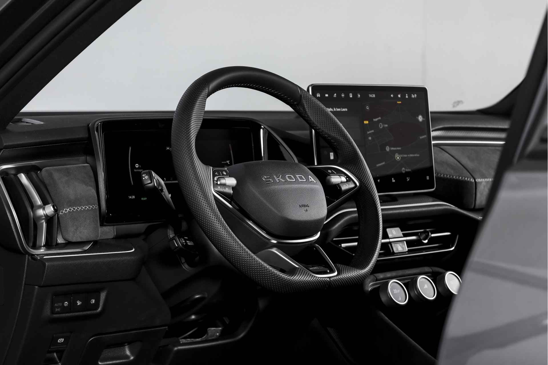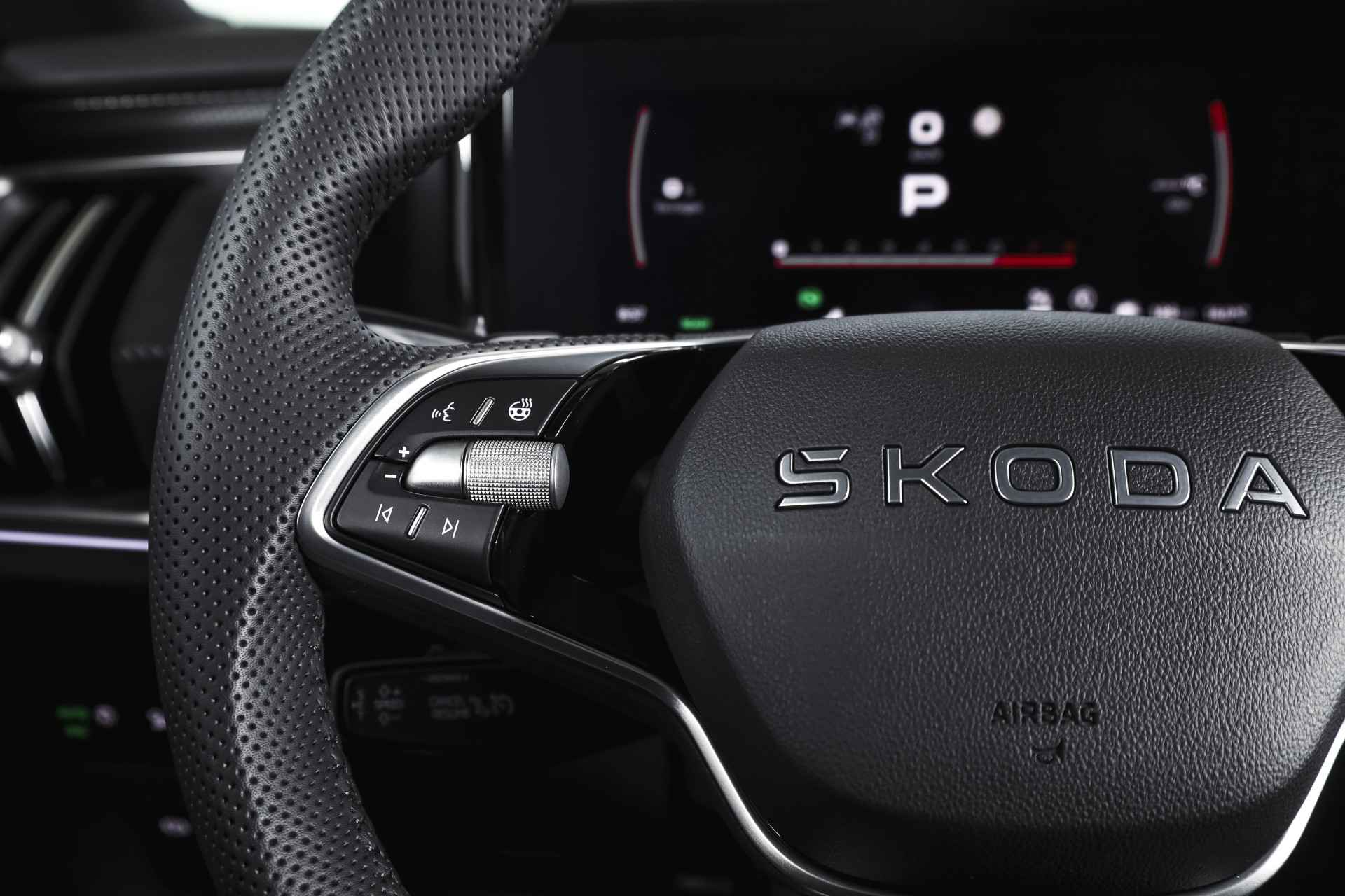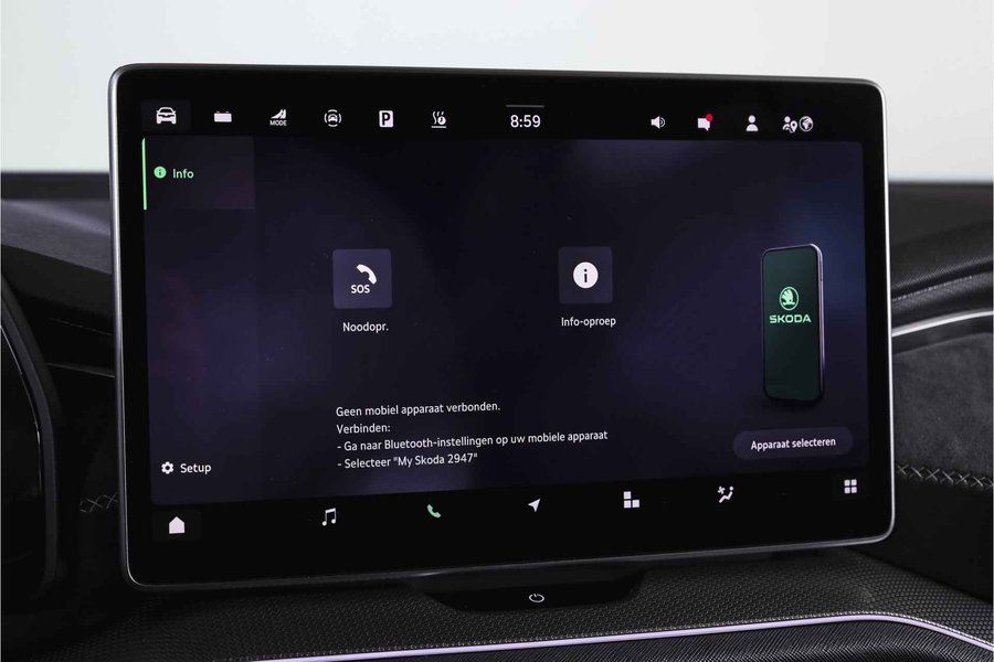 Deze ŠKODA Kodiaq 1.5 TSI PHEV Sportline Business uit 2025 is nagenoeg nieuw met slechts 39 kilometer op de teller. Een ruime, hybride SUV met een sportieve uitstraling en een rijke uitrusting, die comfort en efficiëntie combineert. De plug-in hybride aandrijflijn maakt het mogelijk om tot 123 kilometer volledig elektrisch te rijden (volgens WLTP). Daarmee zijn de meeste dagelijkse ritten stil en emissievrij af te leggen, terwijl de benzinemotor beschikbaar blijft voor langere afstanden. Het Dynamic Chassis Control (DCC+)-systeem is een belangrijk pluspunt: dit adaptieve dempingssysteem past zich continu aan het wegdek en de rijstijl aan. Zo biedt de Kodiaq steeds de juiste balans tussen comfort en sportiviteit – ideaal voor wie graag de controle behoudt, maar ook ontspannen wil rijden. Het interieur is uitgevoerd in microvezel bekleding en voorzien van een elektrisch verstelbare bestuurdersstoel met geheugenfunctie. De afwerking is verzorgd met carbonaccenten en een volledig digitaal instrumentenpaneel, wat bijdraagt aan de moderne uitstraling. Qua technologie is deze Kodiaq uitstekend uitgerust. Het navigatiesysteem en Apple CarPlay/Android Auto zorgen voor een prettige en gebruiksvriendelijke connectiviteit. De achteruitrijcamera, parkeersensoren voor en achter en Matrix LED-koplampen maken elke rit overzichtelijk en veilig, zowel overdag als in het donker. Ook aan comfort is gedacht: het Winter-pakket met verwarmde voorstoelen en verwarmde achterstoelen, in combinatie met de verwarmde voorruit en het verwarmde stuurwiel, zorgen ervoor dat koude dagen geen probleem zijn. De elektrisch bedienbare achterklep maakt laden en lossen bovendien eenvoudig. De Kodiaq staat op 20” lichtmetalen velgen, wat het geheel een stoere en evenwichtige uitstraling geeft. De trekhaak (uitklapbaar) biedt extra functionaliteit voor wie regelmatig een aanhanger of fietsendrager gebruikt. Tot slot zorgt het DAB-radiosysteem voor kraakheldere geluidskwaliteit onderweg.