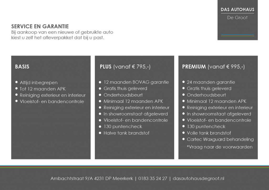 Fiscale waarde € 55.500,- NU OOK MOGELIJK VOOR PRIVATE LEASE! Deze auto bieden we aan bij Das Autohaus de Groot in Meerkerk, onderdeel van Das Autohaus Nederland. De Groot biedt u al meer dan 35 jaar mobiliteit aan. We zetten onze kennis en ervaring graag in om ook voor u de best passende auto te vinden in ons ruime assortiment. Mocht de auto van uw dromen er niet staan, laat het ons dan weten. Wij kunnen met u meedenken en een zoektocht starten naar uw droomauto. Naast de aanschaf of het leasen zijn wij u graag van dienst met persoonlijke service, garantie- en onderhoudswerkzaamheden, schadeherstel en alle andere aanvullende diensten. Dit geldt zowel voor de particulier als voor de zakelijke klant. Voor particulieren bieden wij deze auto standaard aan met: • 12 maanden Bovag garantie, vanaf € 4500.—met maximaal 150.000km • Geldige APK • Bovag 40 punten check • Vloeistoffen controle • Tenaamstellen U heeft de mogelijkheid de auto aan te schaffen met een afleverpakket, dit bevat: • Afleverbeurt naar kilometers • Geldige APK • Halve tank brandstof • Poetsen binnen en buiten (in showroomstaat afleveren) • 12 maanden Bovag garantie • Tenaamstellen • Vanaf prijs is € 795.- U bent van harte welkom om deze, of een andere, auto te komen bezichtigen in onze showroom te Meerkerk, ambachtstraat 9A. Graag zorgen wij er voor dat de auto voor u klaar staat en daarom stellen wij het zeer op prijs als u even laat weten wanneer u langskomt (dan zetten wij de koffie vast klaar!). Voor het maken van een afspraak, het plannen van een proefrit of het stellen van een vraag kunt u ons altijd bellen op ons telefoonnummer 0183-352427. Mailen kan ook met verkoper Luke (lh@dahdegroot.nl), uiteraard zijn we ook bereikbaar op ons mobiele telefoonnummer 06 - 33 14 22 83, hier kunt u ook u vraag per app stellen! Wij helpen u graag! Let ook op onze zeer ruime openingstijden Ma t/m vr van 9.00u tot 19.00u Za van 9.30 uur tot 16.00 uur Zondag zijn wij gesloten. U kunt ons vinden direct aan de A27, afslag 25 Meerkerk, graag tot ziens!