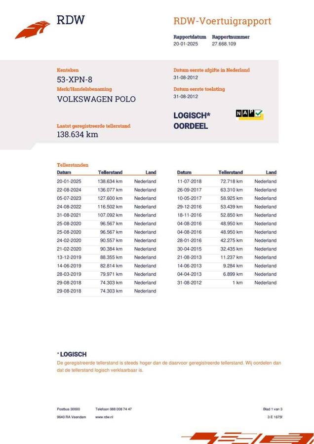 Volkswagen Polo 1.2 TSI BlueMotion Comfort Edition AIRCO CRUISE LM - Kenteken: 53-XPN-8 - Merk: Volkswagen - Model: Polo - APK tot: 05-02-2026 - Tellerstand: 138650 KM - Carrosserievorm: Hatchback - Aantal deuren: 3 - Brandstofsoort: Benzine - Bouwjaar: 2012 - Transmissie: Handgeschakeld - Kleur: grijs - Bekleding: Stof - Kleur interieur: zwart - Motorinhoud: 1197 cc - Aantal cilinders: 4 - Motorcode: CBZ - Vermogen: 66 kW / 90pk - Ledig gewicht: 1007 kg - Max. trekgewicht: 1000 kg - Aantal zitplaatsen: 5 - Verbruik: 4.9 l/100 km - BTW/Marge: Marge, de BTW is niet aftrekbaar - Aantal sleutels: 3 - Onderhoudshistorie aanwezig: Ja - Motorrijtuigenbelasting: € 113 - 123 per kwartaal - Emissieklasse: Euro 5 Comfort - Boordcomputer - Cruise control Exterieur - Achterruitwisser - Afst. bed. voor centr. deurvergr - Buitenspiegel rechts - Buitenspiegels elektrisch verstelbaar - Buitenspiegels in carrosseriekleur - Buitenspiegels verwarmbaar - Bumpers in carrosseriekleur - Centrale vergrendeling - Getint warmtewerend glas - Lichtmetalen velgen 15" - Metaalkleur - Mistlampen voor - Sportvelgen Infotainment - Audioinstallatie met CD-speler - Multimedia-voorbereiding - Radio-CD/MP3 speler Interieur - Achterbank in delen neerklapbaar - Airco - Armsteun voor - Elektrische ramen voor en achter - Microvezel bekleding - Middenarmsteun voor - Stuurbekrachtiging snelheidsafhankelijk - Voorstoelen in hoogte verstelbaar Overige - Anti Blokkeer Systeem - Anti doorSlip Regeling - Bestuurdersairbag - Elektronisch Stabiliteits Programma - Elektronische remkrachtverdeling - Passagiersairbag - Zij airbag(s) voor Veiligheid - Alarm klasse 1(startblokkering) - Bandenspanningscontrolesysteem - Isofix bevestiging voor kinderzitjes Met zijn dynamische eigenschappen belooft deze Volkswagen Polo u een heleboel rijplezier. Hij is ontwikkeld op een geavanceerd onderstel en biedt altijd een veilig weggedrag. Een belangrijke eigenschap van iedere Volkswagen is zijn duurzaamheid. Dat ziet u ook aan deze Polo. In deze auto vindt u een benzinemotor en een handgeschakelde versnellingsbak. Natuurlijk behoren 15 inch lichtmetalen velgen, warmtewerend glas, in hoogte verstelbare voorstoelen, in delen neerklapbare achterbank, elektrisch bedienbare en verwarmde buitenspiegels en elektrisch bediende ramen ook tot de uitrusting van deze complete auto. Er is ook cruise control aan boord, om met een constant tempo ontspannen en zuinig te rijden. Ja, airconditioning is er natuurlijk ook in deze auto. Met isofix-aansluiting, centrale deurvergrendeling met afstandsbediening en boordcomputer is deze auto helemaal compleet. De nieuwste veiligheidssystemen komen in deze Volkswagen Polo samen. Slappe banden zijn niet alleen gevaarlijk en kostbaar, maar slijten ook sneller. Gelukkig waarschuwt het bandenspanningscontrolesysteem tijdig bij drukverlies. Natuurlijk kunt u de kwaliteiten van deze auto pas echt beoordelen na een proefrit. Neem nu contact met ons op, dan zetten wij hem voor u klaar. U kunt deze deze auto financieren vanaf €119,00 per maand. Voor meer vragen of informatie kunt u ons altijd bellen mailen of smsen. Kijk ook eens naar onze andere voordelige advertenties. Onze garantie/rijklaar pakketten Instapgarantie (€399,-) Auto's van 10 - 15 jaar oud en tot 175.000 km. Inclusief: 12 maand garantie. Nieuwe APK. Algehele check. Kleine onderhoudsbeurt. Excellent garantie (€499,-) Auto's tot 10 jaar oud en tot 175.000 km. Inclusief: 12 maand garantie. Nieuwe APK. Algehele check. Kleine onderhoudsbeurt. Excellent plus garantie (€699,-) Auto's tot 10 jaar oud en tot 175.000 km. Inclusief: 12 maand garantie. Nieuwe APK. Algehele check. Grote onderhoudsbeurt. Exclusive garantie (€1499,-) Speciaal voor onze exclusives. Auto's tot 10 jaar oud en tot 175.000 km. Inclusief: 12 maand garantie Nieuwe APK. Algehele check Inclusief onderhoudsbeurt. Onze advertenties worden met grote zorgvuldigheid op het internet geplaatst. Mocht er onverhoopt toch een fout in staan, dan kan hieraan geen rechten worden ontleend.  Financiering is mogelijk. Whatsapp ons op:  06-552 318 32 RTO autoservice Zuiderdiep 408 7876 AW Valthermond 0599 72 70 12 info@rtoautoservice.nl www.rtoautoservice.nl/