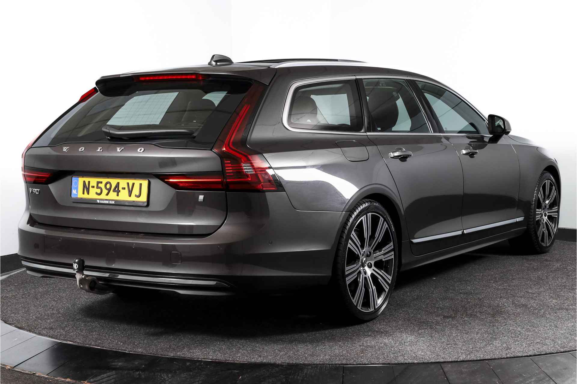 Deze Volvo V90 2.0 B4 Inscription Automaat uit 2022 is een origineel Nederlands geleverde auto met een kilometerstand van 42.089 km. Een comfortabele en zeer complete reisauto, waarbij rust, ruimte en afwerking duidelijk centraal staan. Tijdens het rijden valt het volledig digitaal instrumentenpaneel direct op, dat samenwerkt met het navigatiesysteem full map + hard disk. Via Apple CarPlay/Android Auto is je smartphone eenvoudig te koppelen voor navigatie, muziek en telefonie. De aanwezigheid van DAB-radio zorgt daarbij voor een heldere geluidskwaliteit. Voor lange afstanden is deze V90 prettig uitgerust met cruise control adaptief met stop&go en stuurhulp, wat vooral in druk verkeer en op de snelweg bijdraagt aan ontspannen rijden. Op het gebied van veiligheid en overzicht beschikt de auto over dodehoekdetectie met correctie, parkeersensoren voor en achter, een achteruitrijcamera en een rondomzicht camera, waardoor inparkeren en manoeuvreren overzichtelijk blijft. Het interieur is afgewerkt met lederen bekleding en biedt veel zitcomfort. Zowel de elektrisch verstelbare bestuurdersstoel met geheugen als de elektrisch verstelbare passagiersstoel met geheugen zorgen ervoor dat je altijd snel de juiste zitpositie vindt. De voorstoelen zijn verwarmd, net als het stuurwiel en de achterbank, wat deze Volvo ook tijdens koude dagen bijzonder comfortabel maakt. De temperatuur in het interieur wordt geregeld via electronic climate control. Ook praktisch is deze V90 goed doordacht. De elektrisch bedienbare achterklep met sensorsturing maakt in- en uitladen eenvoudig, terwijl de dakrails extra mogelijkheden bieden voor bagage of een dakkoffer. Het grote elektrisch glazen schuif-/kanteldak zorgt voor extra licht en een ruimtelijk gevoel in het interieur. Daarnaast is de auto voorzien van een elektrisch uitklapbare trekhaak, netjes weggewerkt wanneer deze niet in gebruik is. Het geheel staat op 20 inch lichtmetalen velgen, wat de auto een krachtige en verzorgde uitstraling geeft, passend bij de Inscription-uitvoering. Een complete en comfortabele Volvo V90 die klaar is voor zowel dagelijks gebruik als lange ritten, met een uitrusting die gericht is op gemak, veiligheid en rijcomfort.